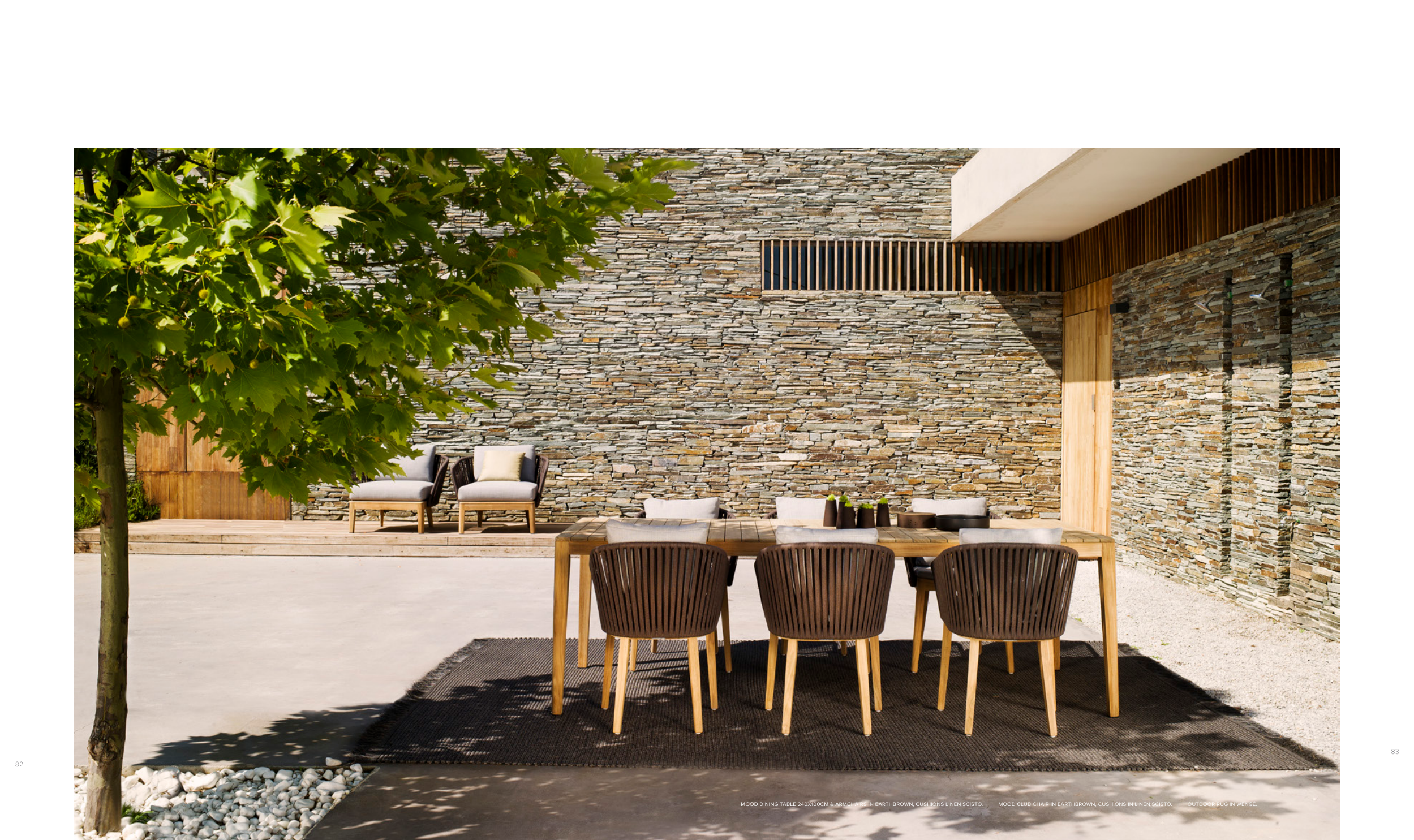 MOOD DINING TABLE 240X100CM & ARMCHAIRS IN EARTHBROWN, CUSHIONS LINEN SCISTO. MOOD CLUB CHAIR IN EARTHBROWN, CUSHIONS IN LINEN SCISTO. OUTDOOR RUG IN WENGÉ.