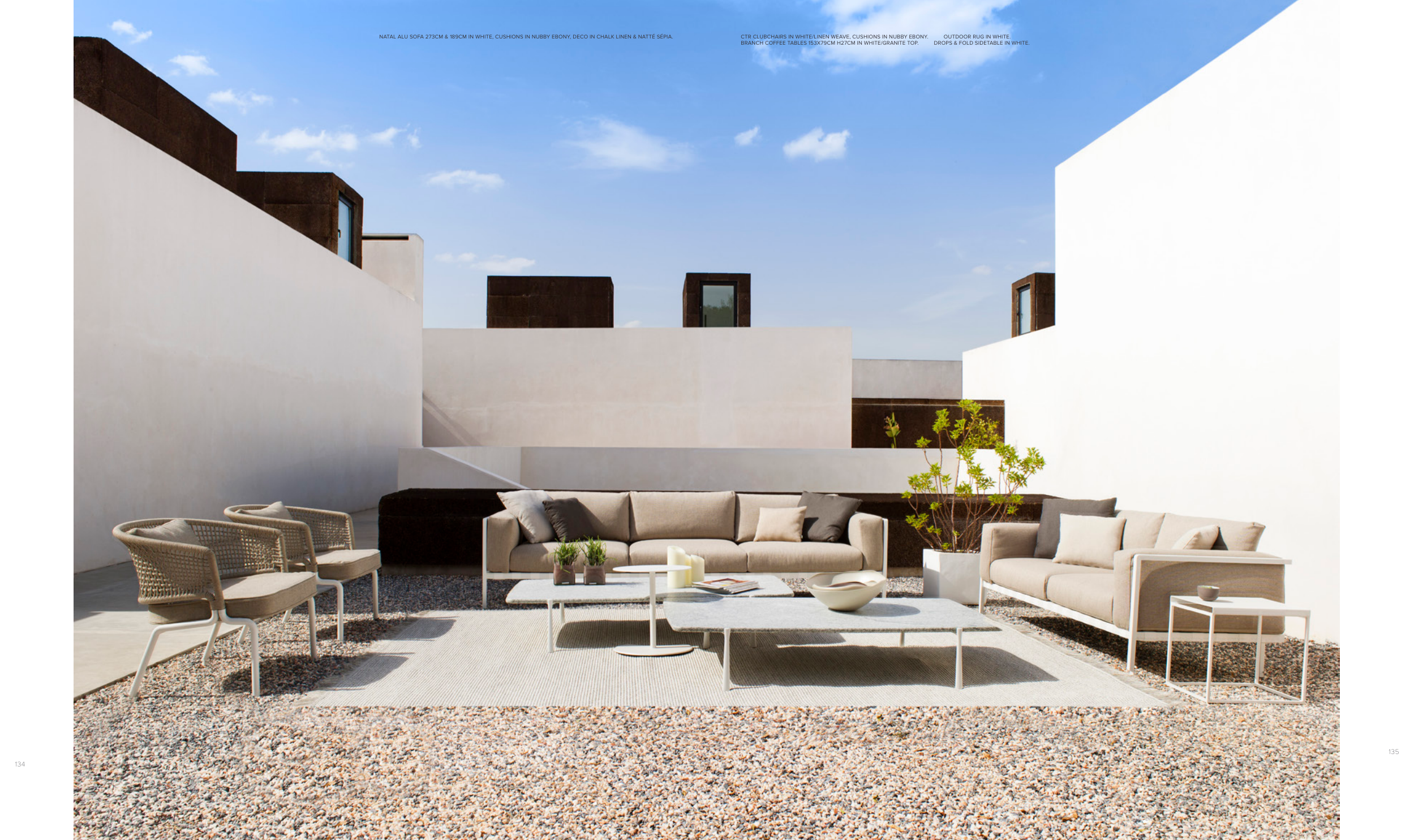 NATAL ALU SOFA 273CM & 189CM IN WHITE, CUSHIONS IN NUBBY EBONY, DECO IN CHALK LINEN & NATTÉ SÉPIA.