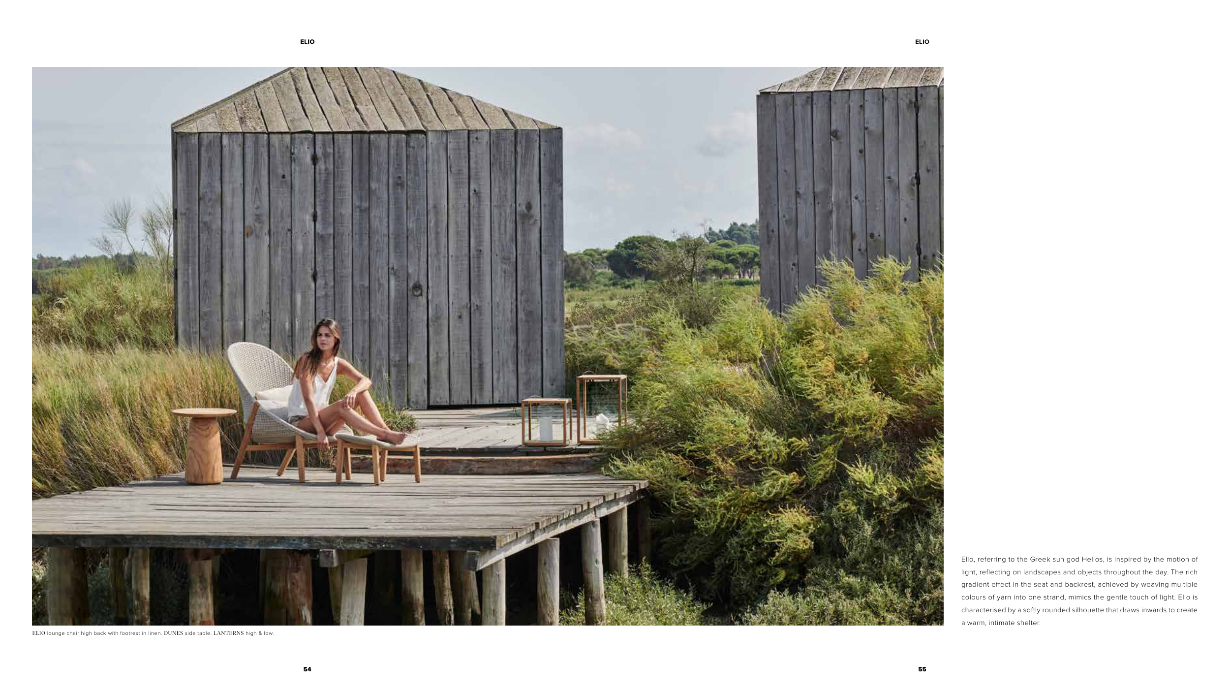 ELIO lounge chair high back with footrest in linen. DUNES side table. LANTERNS high & low.