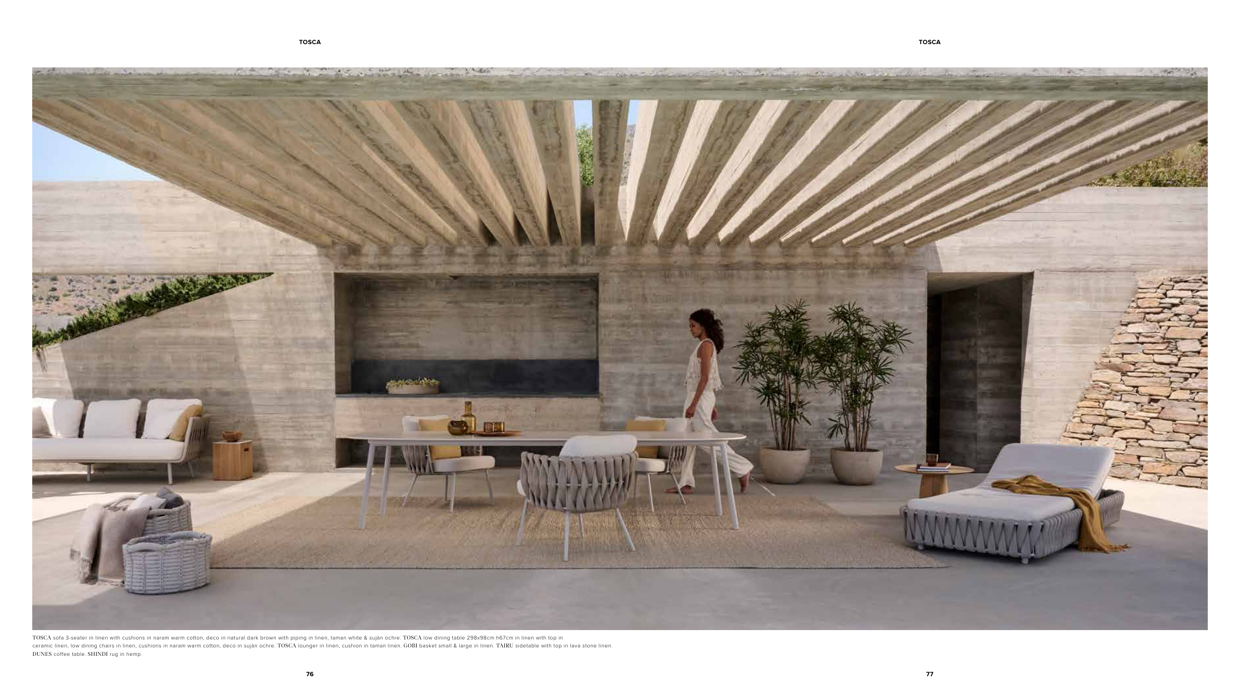 ceramic linen, low dining chairs in linen, cushions in naram warm cotton, deco in sujàn ochre. TOSCA lounger in linen, cushion in taman linen. GOBI basket small & large in linen. TAIRU sidetable with top in lava stone linen.