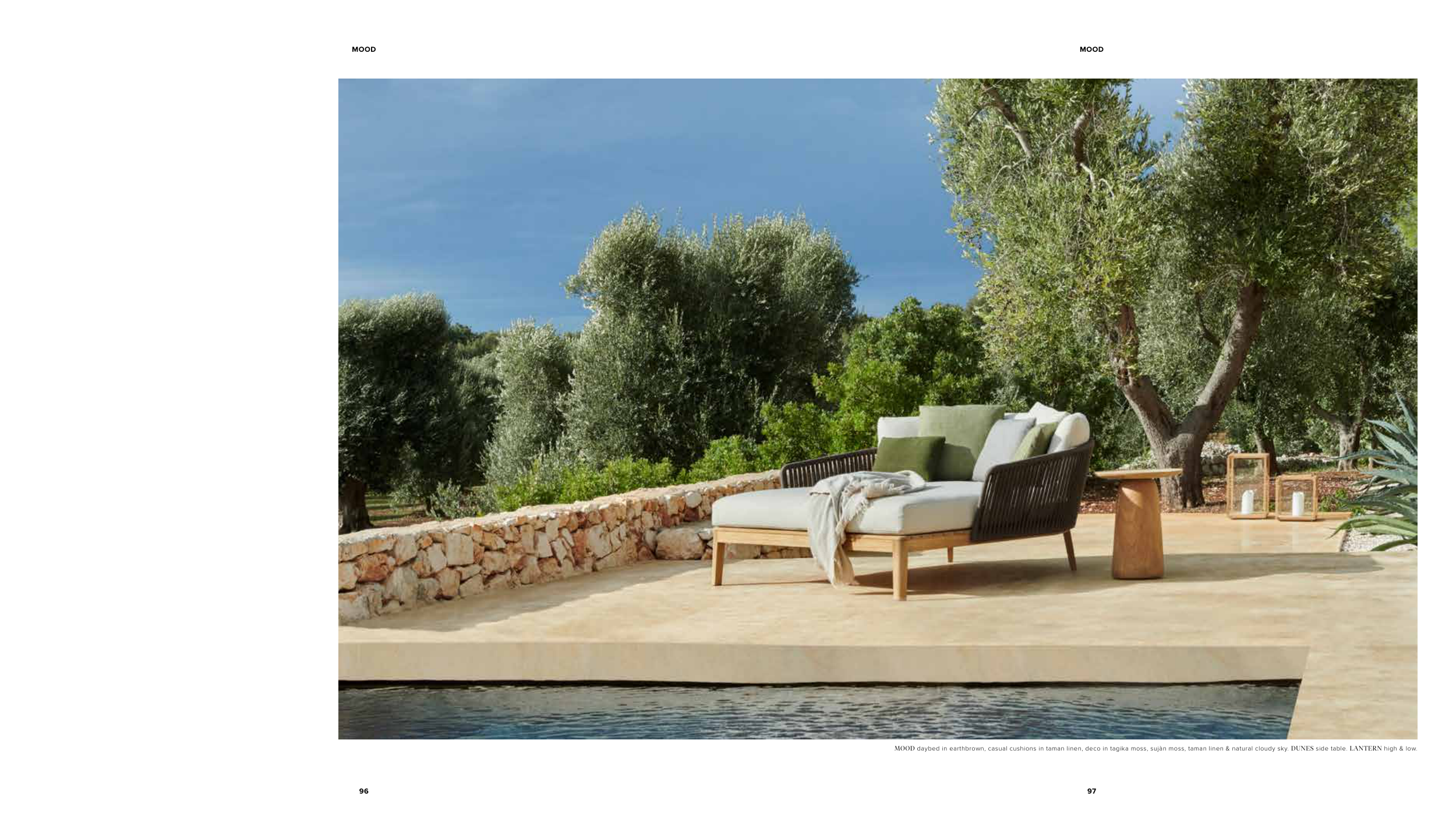 MOOD daybed in earthbrown, casual cushions in taman linen, deco in tagika moss, sujàn moss, taman linen & natural cloudy sky. DUNES side table. LANTERN high & low.