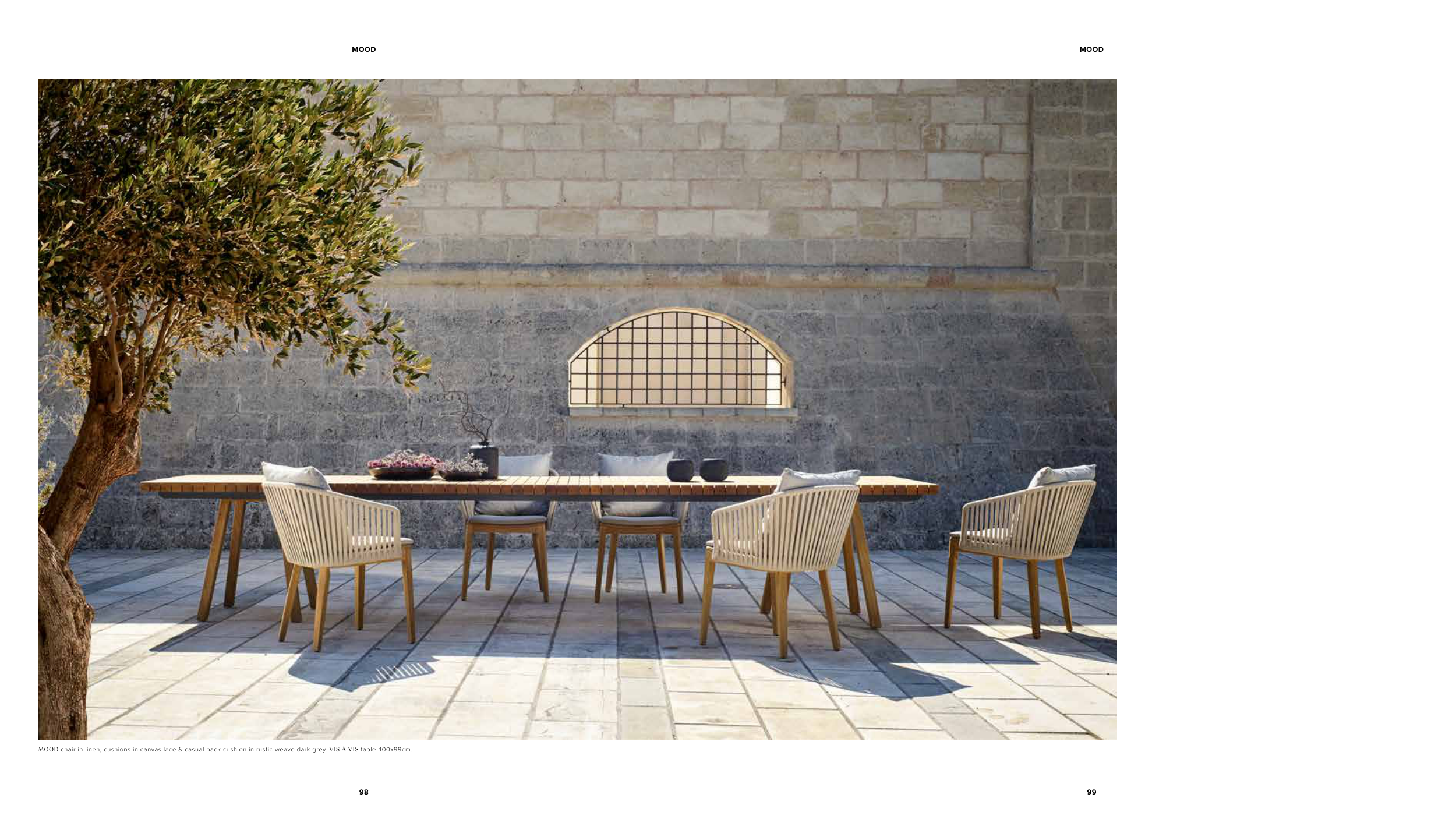 MOOD chair in linen, cushions in canvas lace & casual back cushion in rustic weave dark grey. VIS À VIS table 400x99cm.