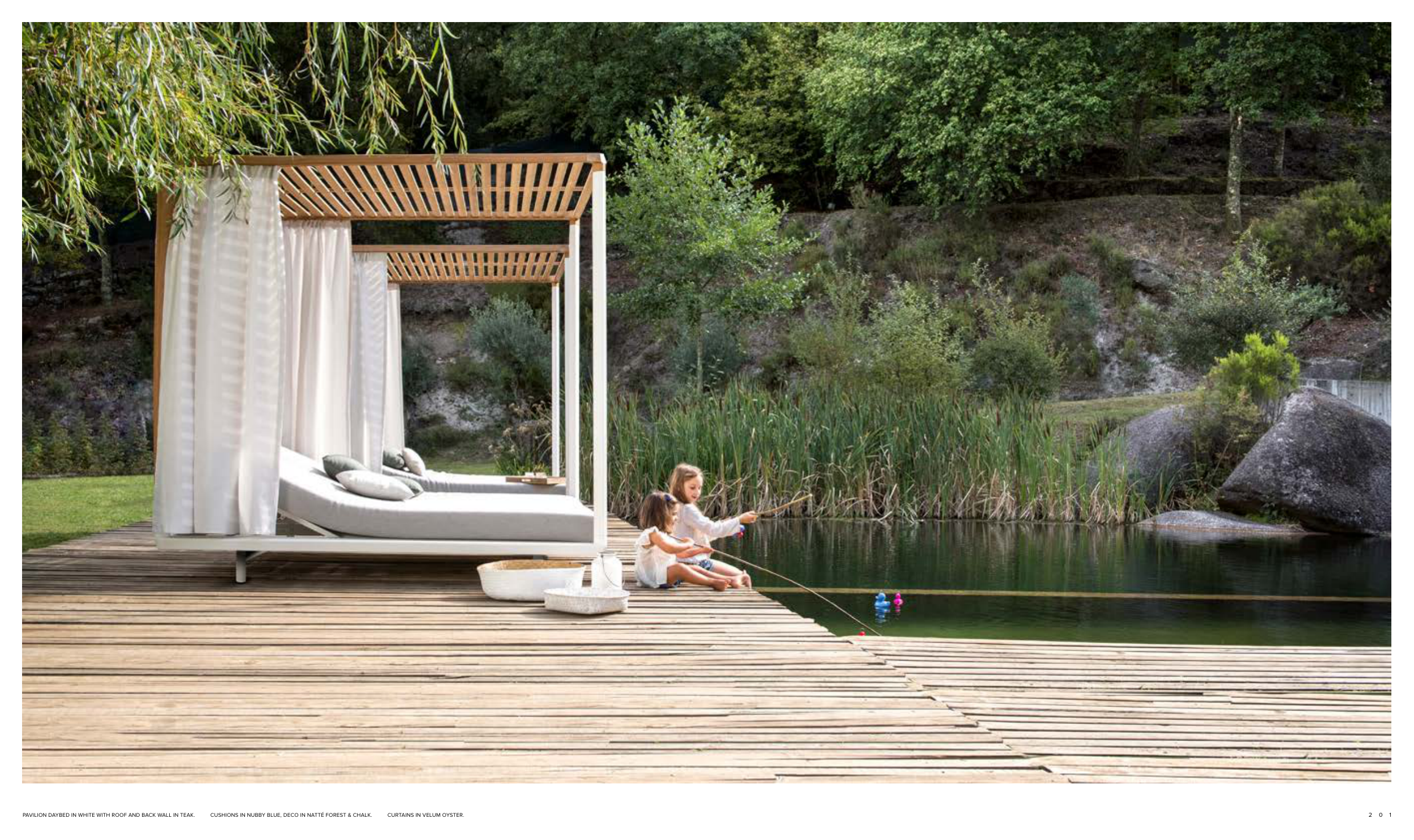 PAVILION DAYBED IN WHITE WITH ROOF AND BACK WALL IN TEAK. CUSHIONS IN NUBBY BLUE, DECO IN NATTÉ FOREST & CHALK. CURTAINS IN VELUM OYSTER.