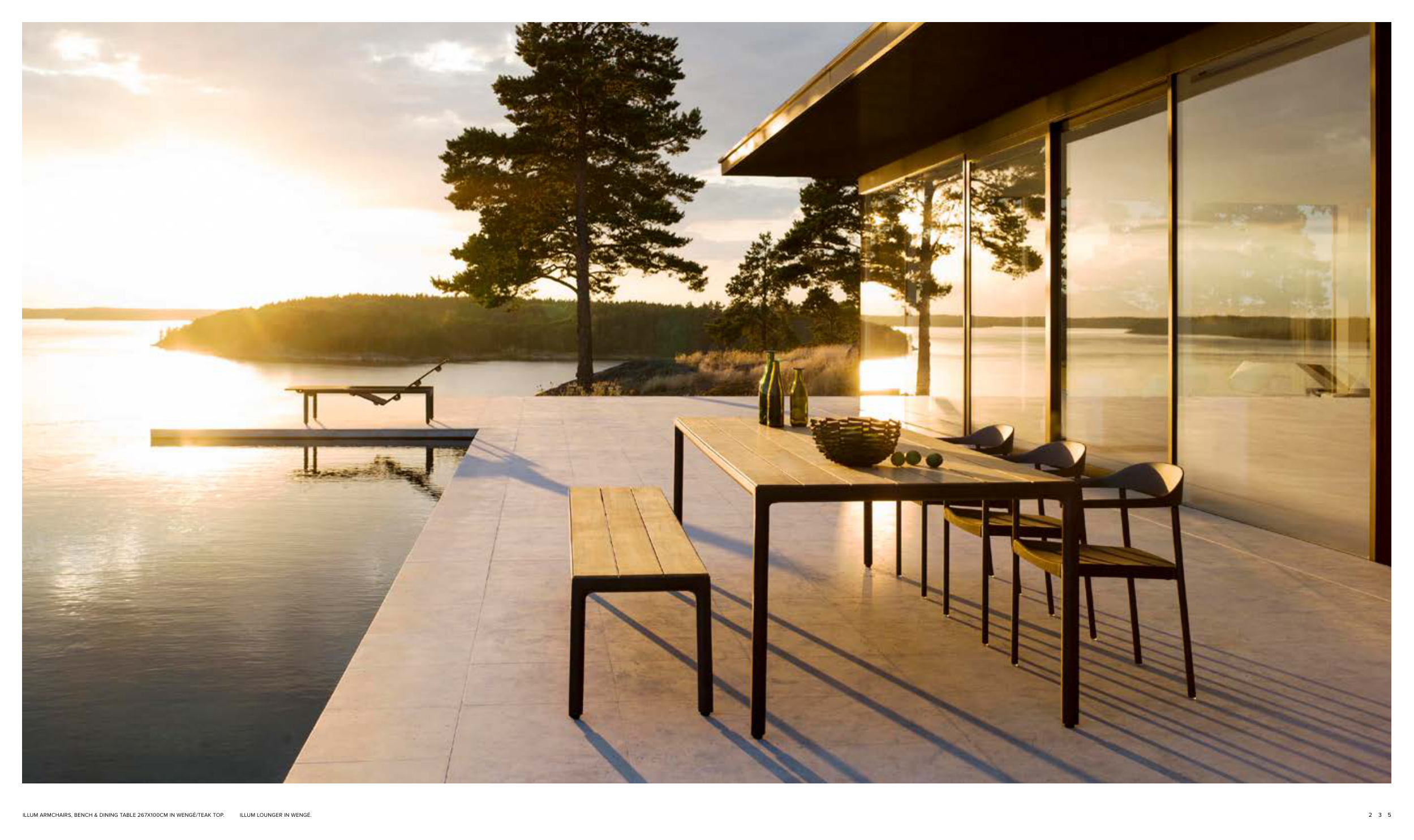ILLUM ARMCHAIRS, BENCH & DINING TABLE 267X100CM IN WENGÉ/TEAK TOP. ILLUM LOUNGER IN WENGÉ.