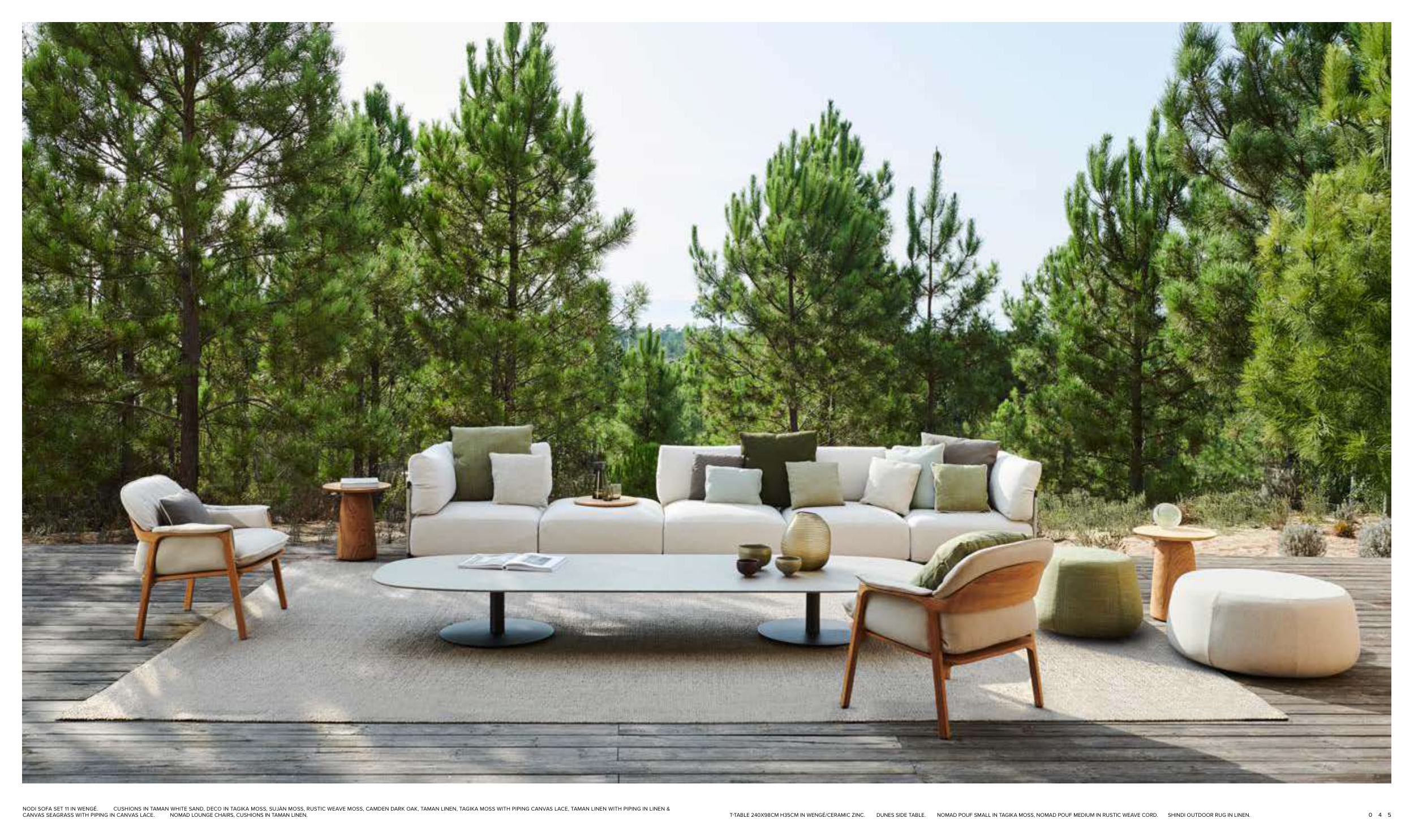 T-TABLE 240X98CM H35CM IN WENGÉ/CERAMIC ZINC. DUNES SIDE TABLE. NOMAD POUF SMALL IN TAGIKA MOSS, NOMAD POUF MEDIUM IN RUSTIC WEAVE CORD. SHINDI OUTDOOR RUG IN LINEN.