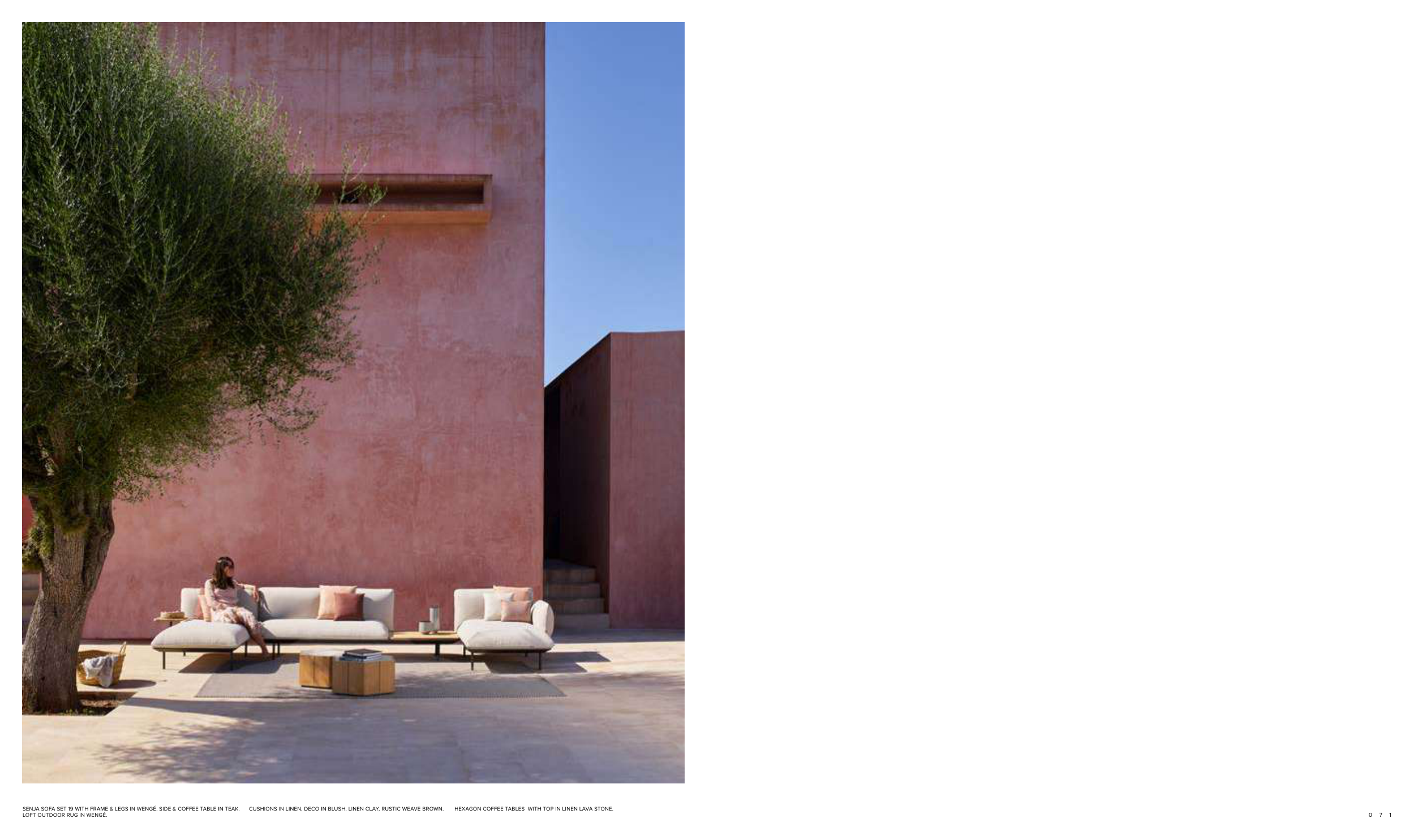 SENJA SOFA SET 19 WITH FRAME & LEGS IN WENGÉ, SIDE & COFFEE TABLE IN TEAK. CUSHIONS IN LINEN, DECO IN BLUSH, LINEN CLAY, RUSTIC WEAVE BROWN. HEXAGON COFFEE TABLES WITH TOP IN LINEN LAVA STONE.