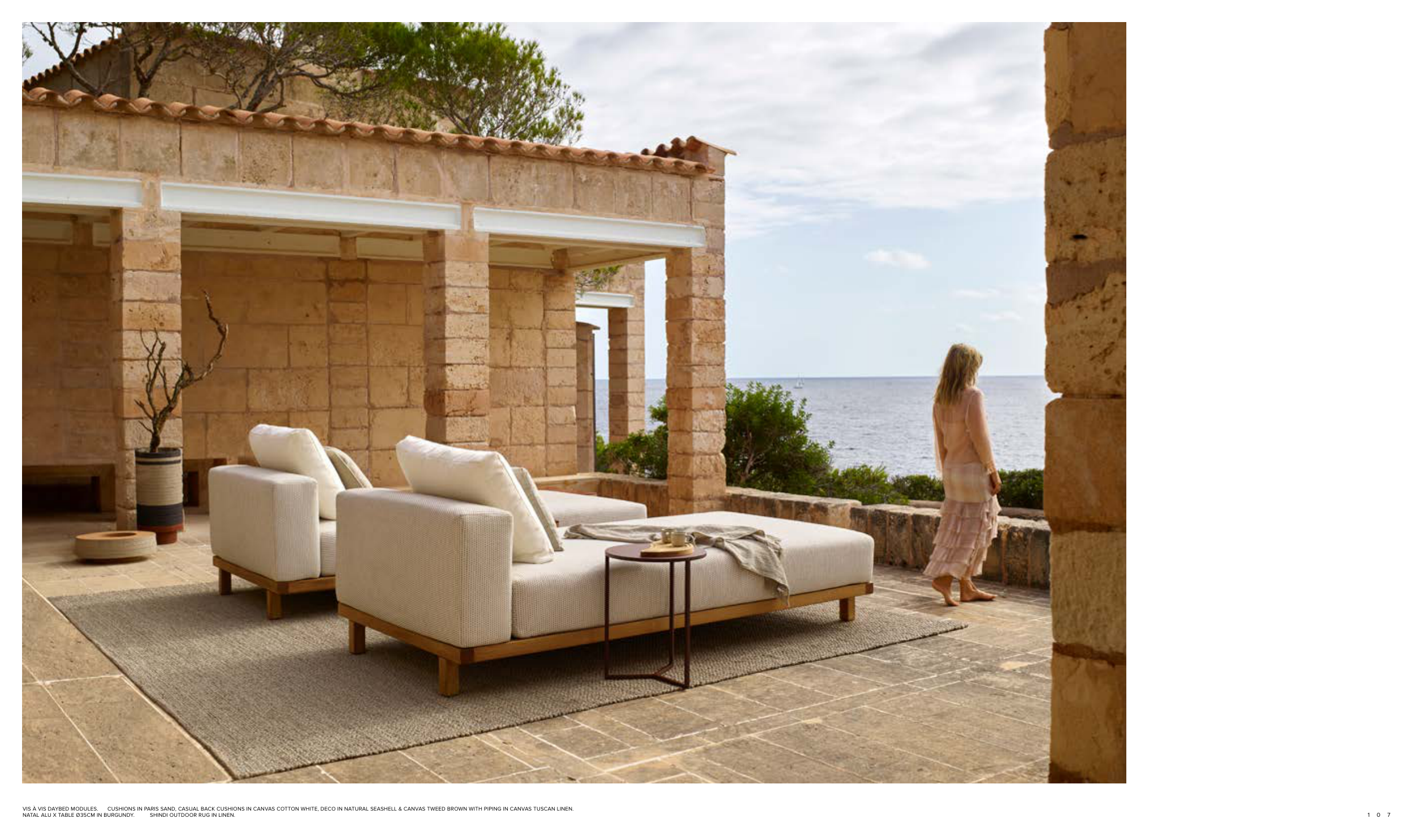 VIS À VIS DAYBED MODULES. CUSHIONS IN PARIS SAND, CASUAL BACK CUSHIONS IN CANVAS COTTON WHITE, DECO IN NATURAL SEASHELL & CANVAS TWEED BROWN WITH PIPING IN CANVAS TUSCAN LINEN.