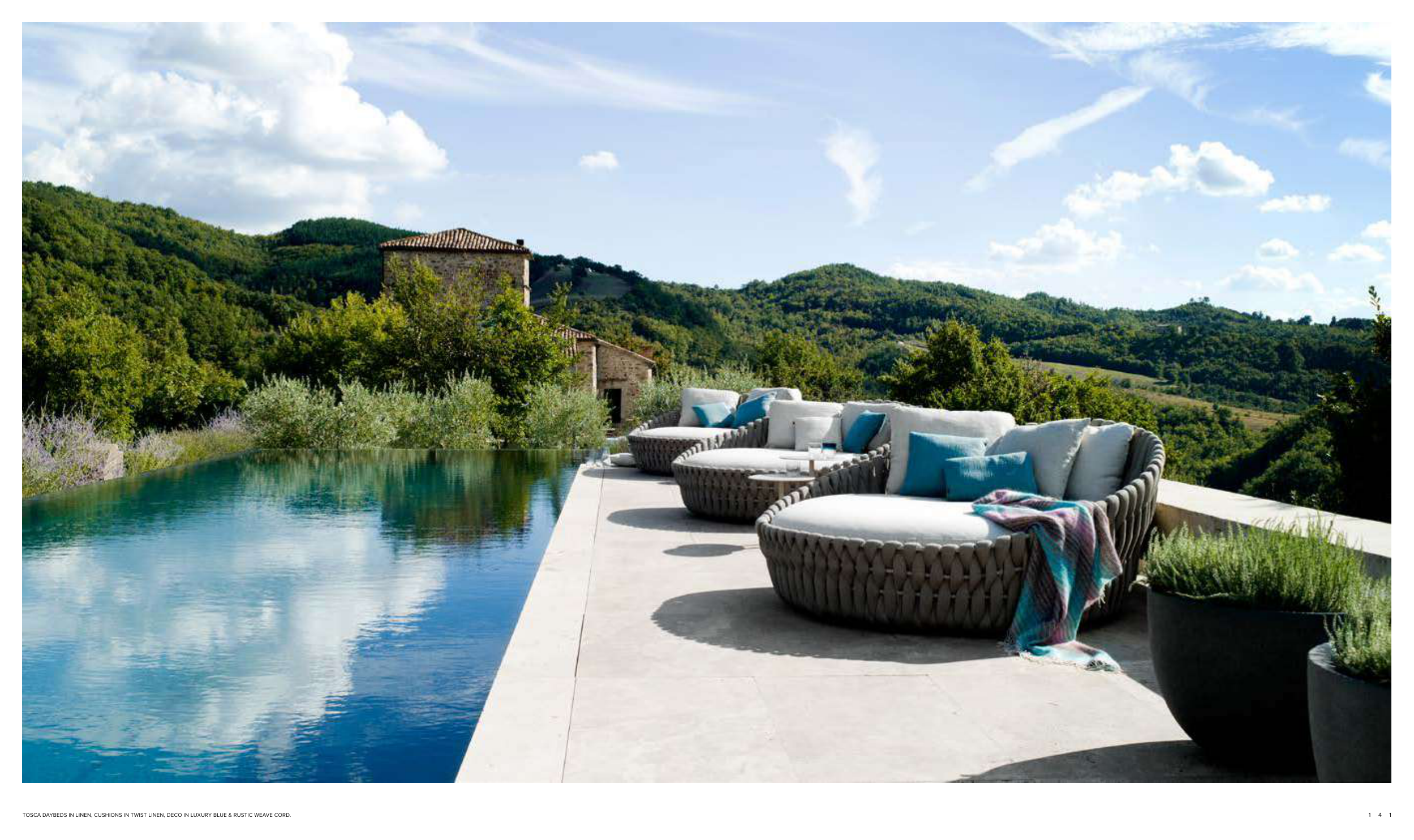 TOSCA DAYBEDS IN LINEN, CUSHIONS IN TWIST LINEN, DECO IN LUXURY BLUE & RUSTIC WEAVE CORD.