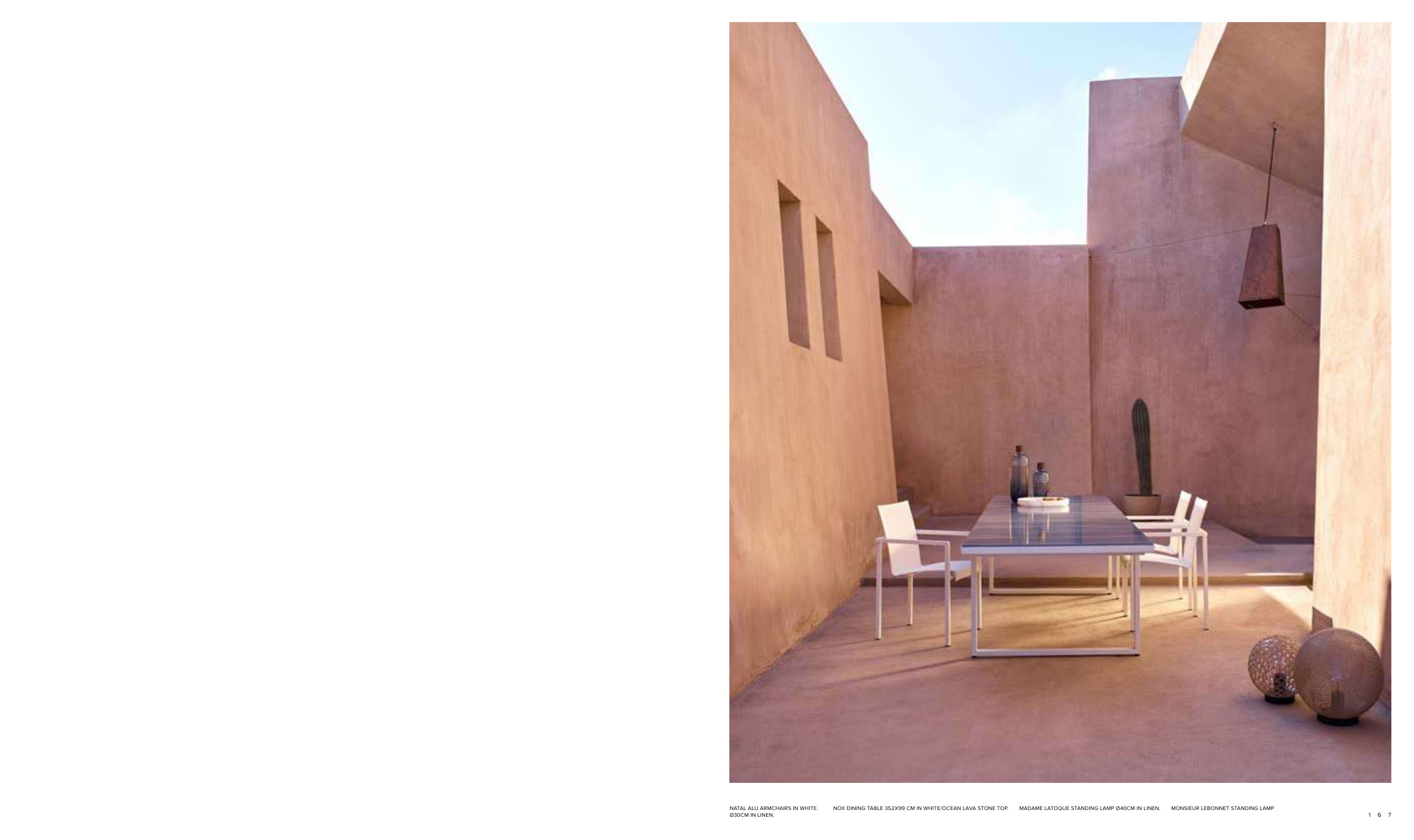NATAL ALU ARMCHAIRS IN WHITE. NOX DINING TABLE 352X99 CM IN WHITE/OCEAN LAVA STONE TOP. MADAME LATOQUE STANDING LAMP Ø40CM IN LINEN. MONSIEUR LEBONNET STANDING LAMP