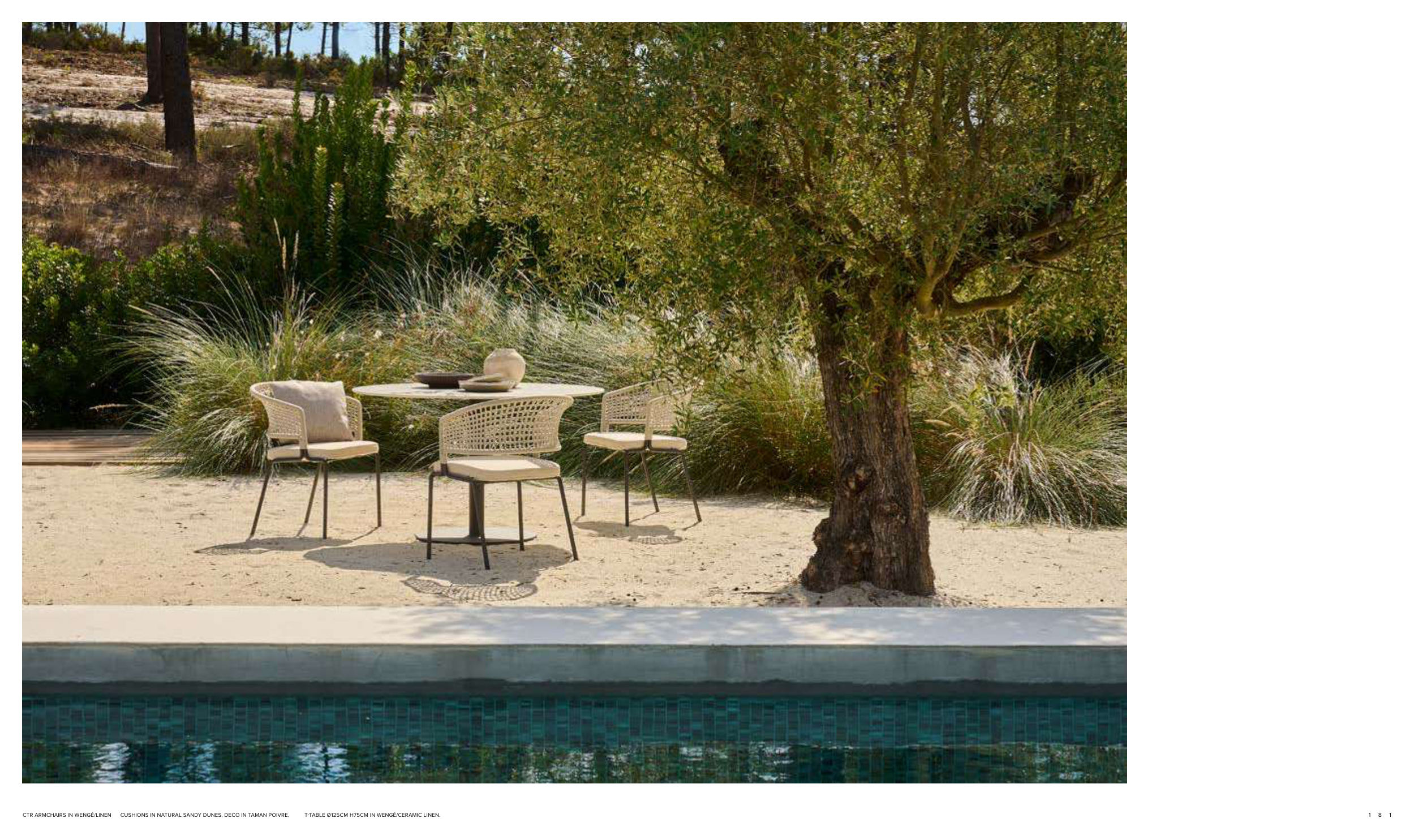 CTR ARMCHAIRS IN WENGÉ/LINEN CUSHIONS IN NATURAL SANDY DUNES, DECO IN TAMAN POIVRE. T-TABLE Ø125CM H75CM IN WENGÉ/CERAMIC LINEN.