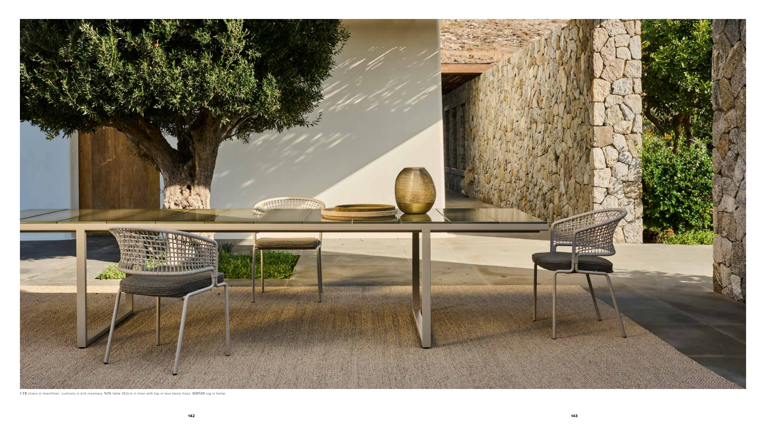 CTR chairs in linen/linen, cushions in knit rosemary. NOX table 352cm in linen with top in lava stone moss. SHINDI rug in hemp.