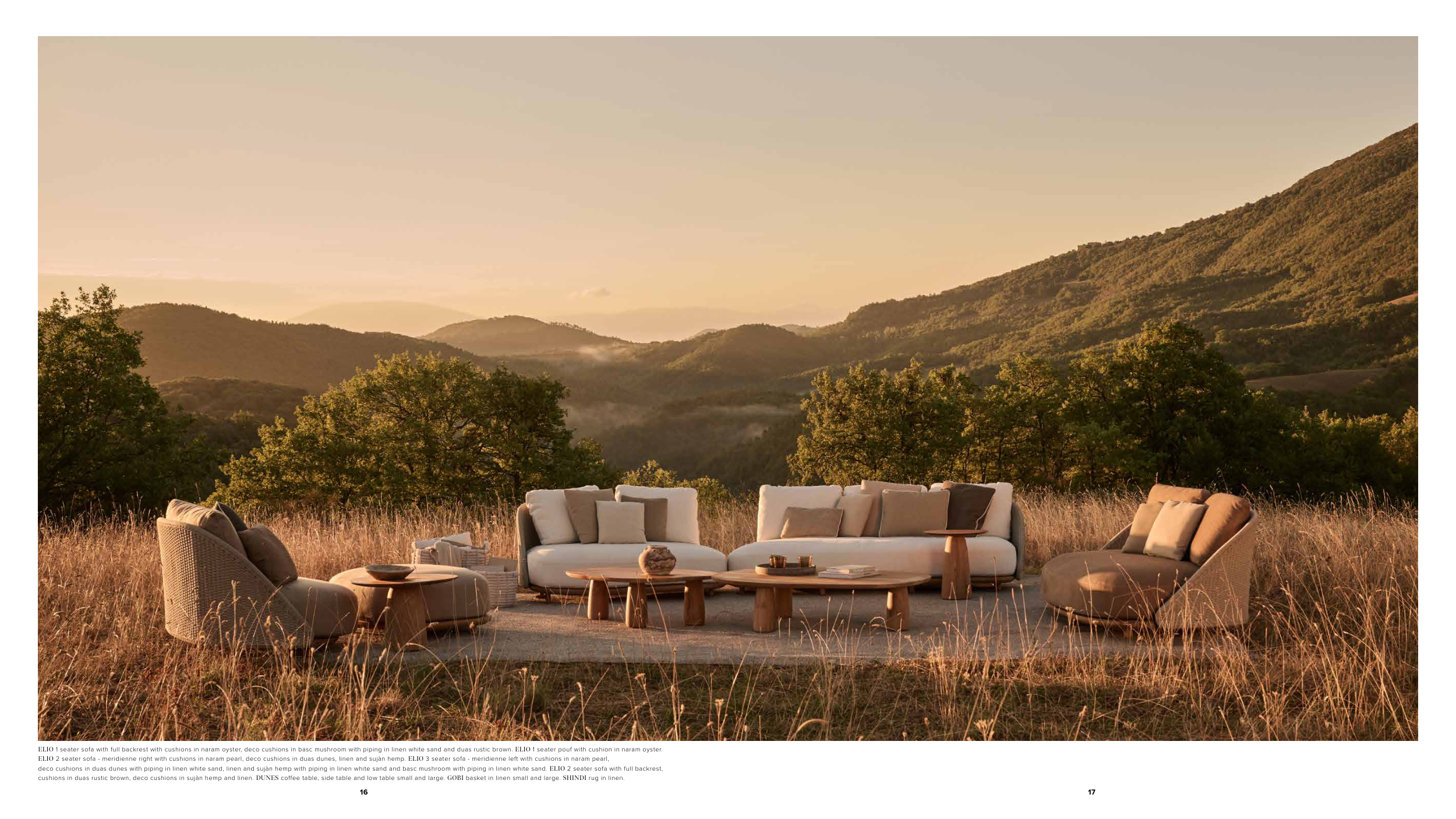 cushions in duas rustic brown, deco cushions in sujàn hemp and linen. DUNES coffee table, side table and low table small and large. GOBI basket in linen small and large. SHINDI rug in linen.