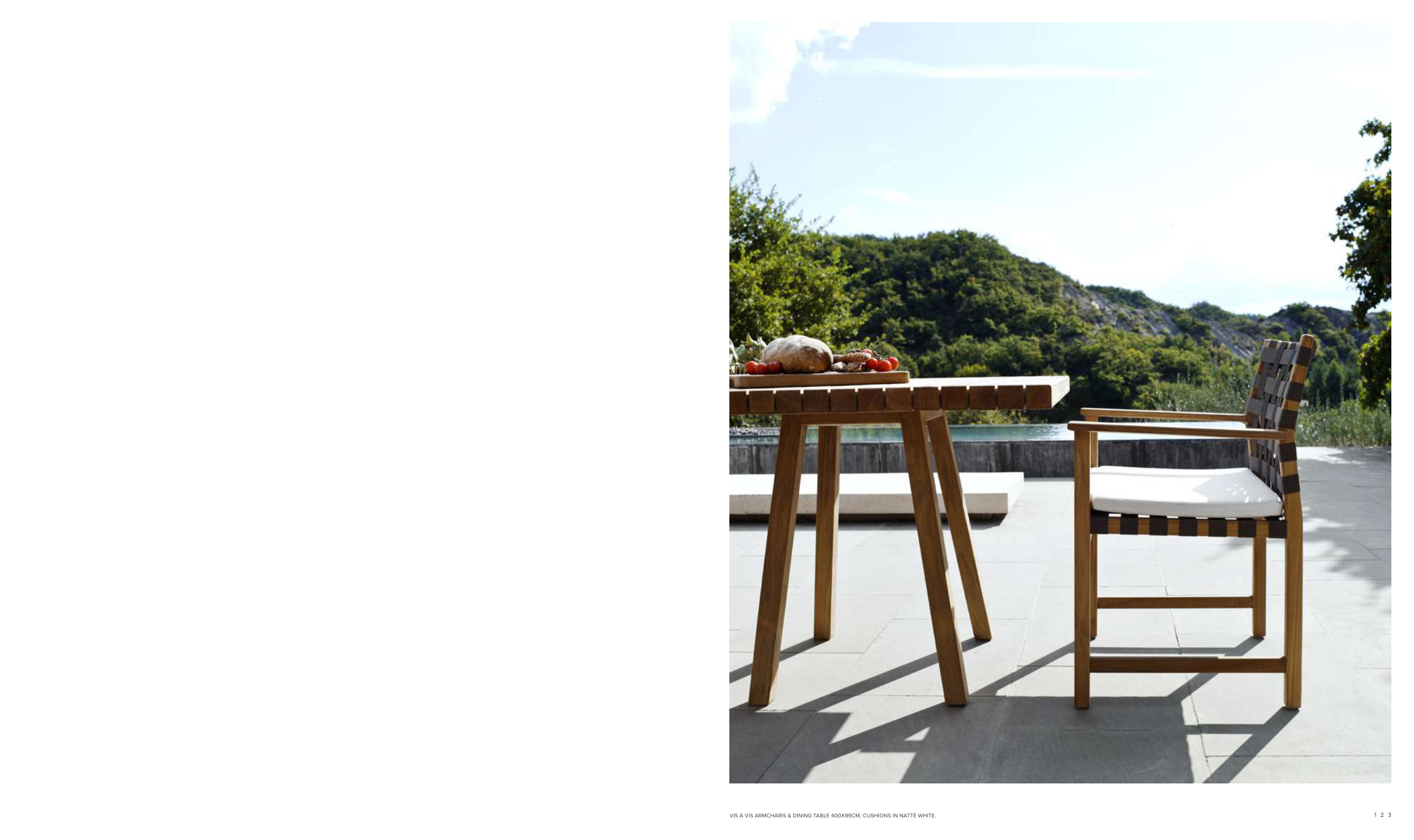 VIS À VIS ARMCHAIRS & DINING TABLE 400X99CM, CUSHIONS IN NATTÉ WHITE.