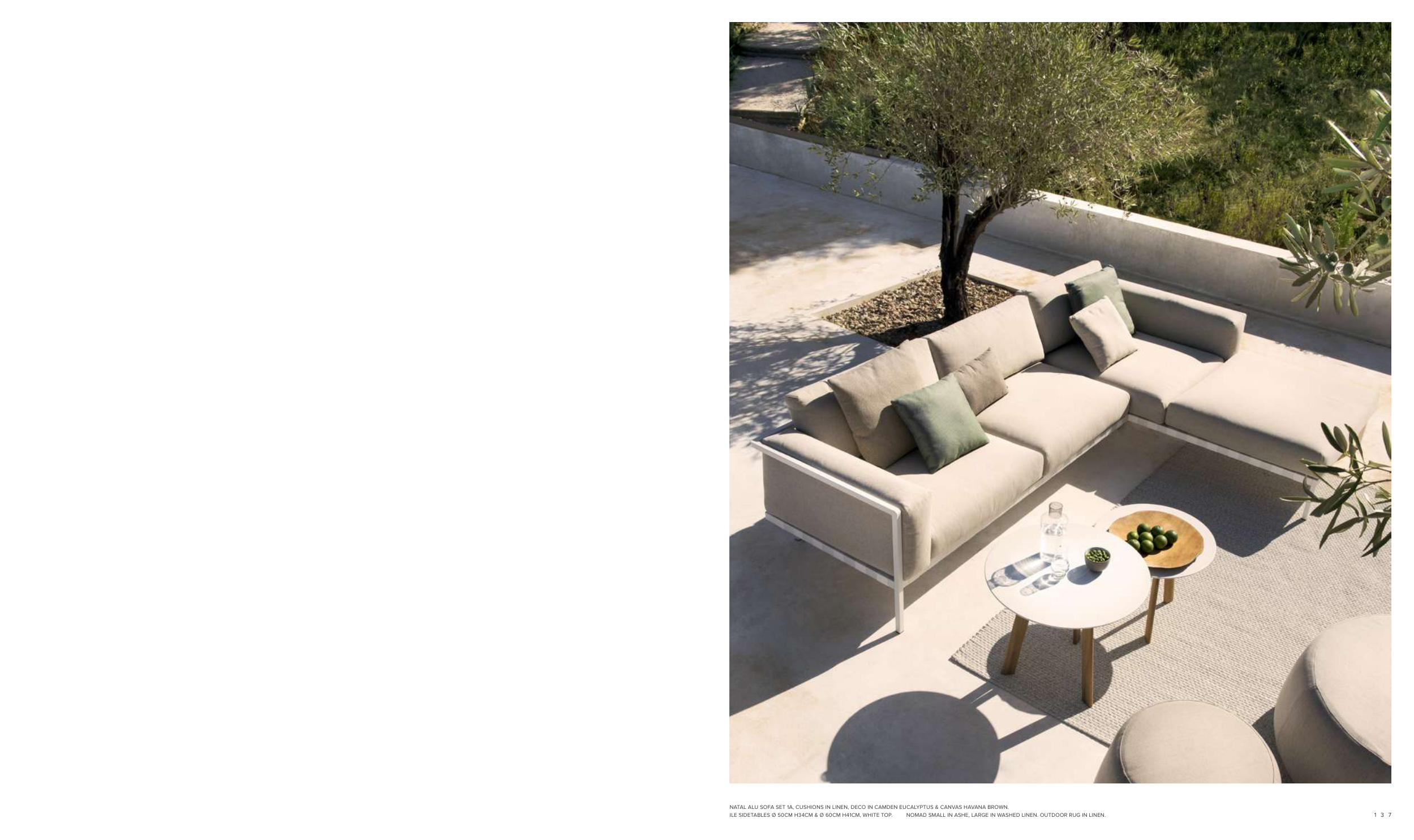 ILE SIDETABLES Ø 50CM H34CM & Ø 60CM H41CM, WHITE TOP. NOMAD SMALL IN ASHE, LARGE IN WASHED LINEN. OUTDOOR RUG IN LINEN.