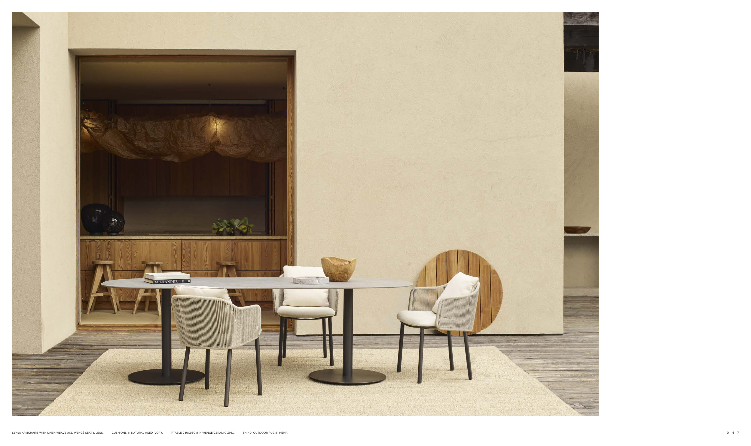 SENJA ARMCHAIRS WITH LINEN WEAVE AND WENGÉ SEAT & LEGS. CUSHIONS IN NATURAL AGED IVORY. T-TABLE 240X98CM IN WENGÉ/CERAMIC ZINC. SHINDI OUTDOOR RUG IN HEMP.