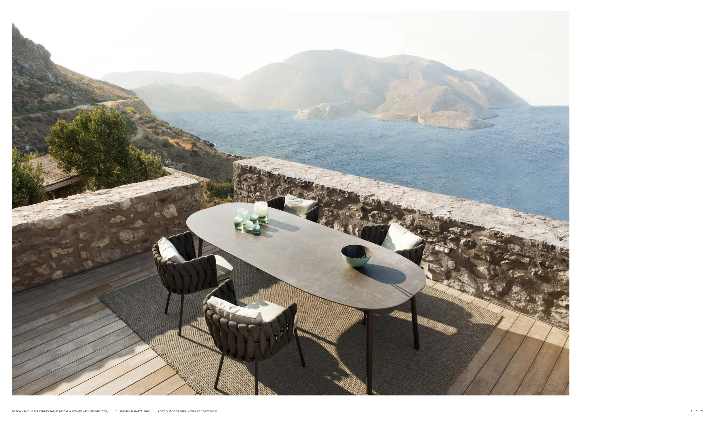 TOSCA ARMCHAIR & DINING TABLE 240CM IN WENGÉ WITH PIOMBO TOP, CUSHIONS IN NATTÉ ANIS. LOFT OUTDOOR RUG IN WENGÉ 250X350CM.