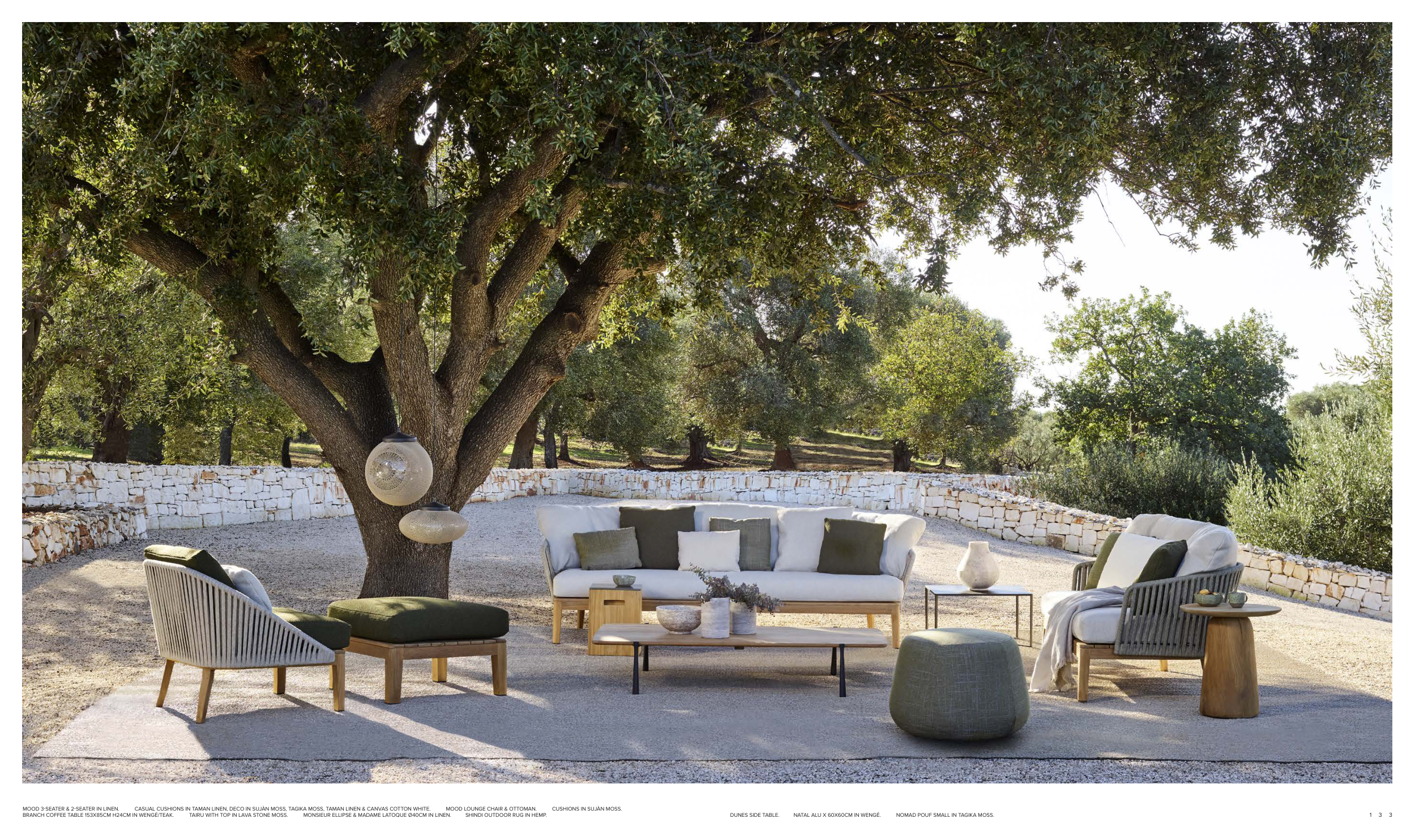 MOOD 3-SEATER & 2-SEATER IN LINEN. CASUAL CUSHIONS IN TAMAN LINEN, DECO IN SUJÀN MOSS, TAGIKA MOSS, TAMAN LINEN & CANVAS COTTON WHITE. MOOD LOUNGE CHAIR & OTTOMAN. CUSHIONS IN SUJÀN MOSS.