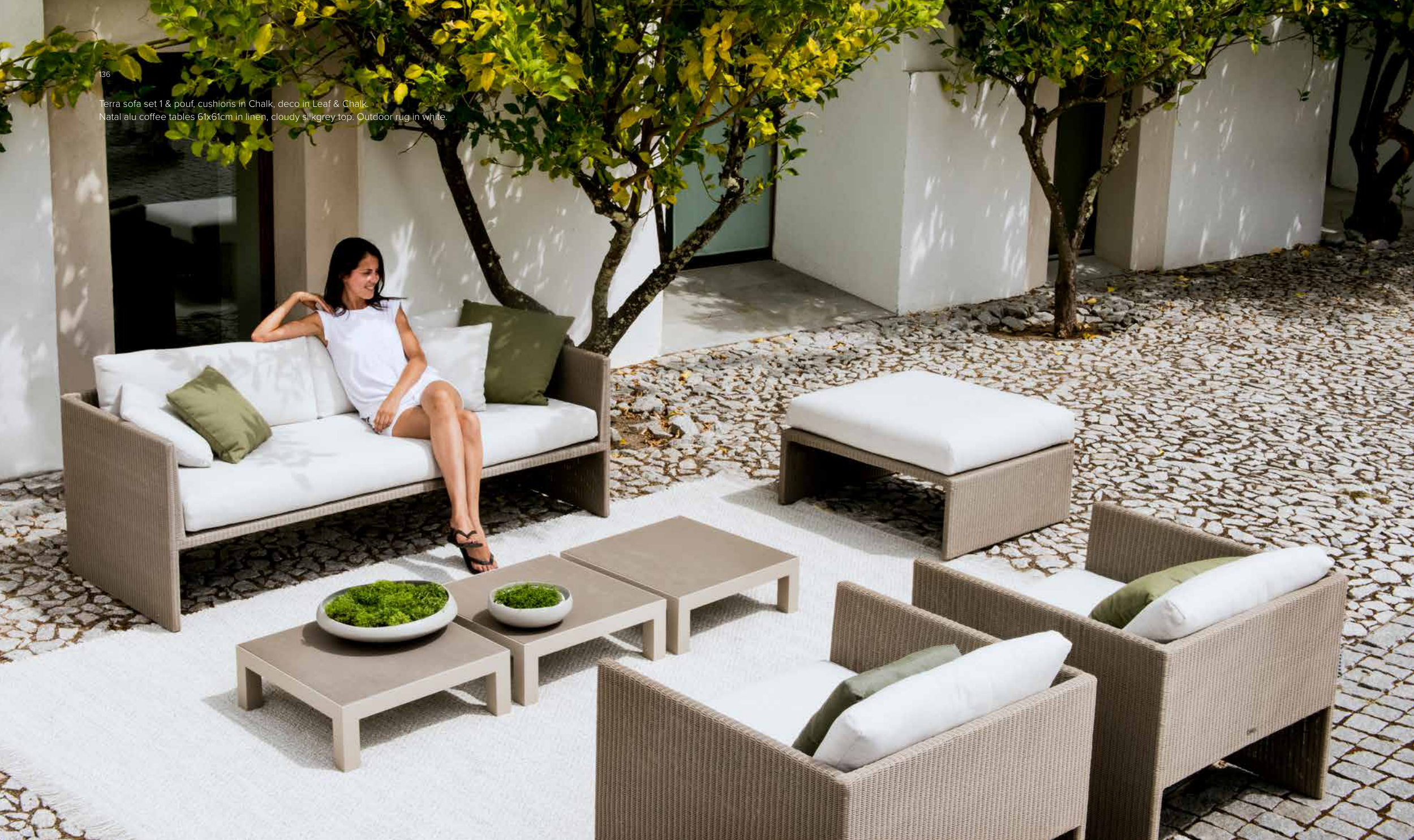 Natal alu coffee tables 61x61cm in linen, cloudy silkgrey top. Outdoor rug in white.
