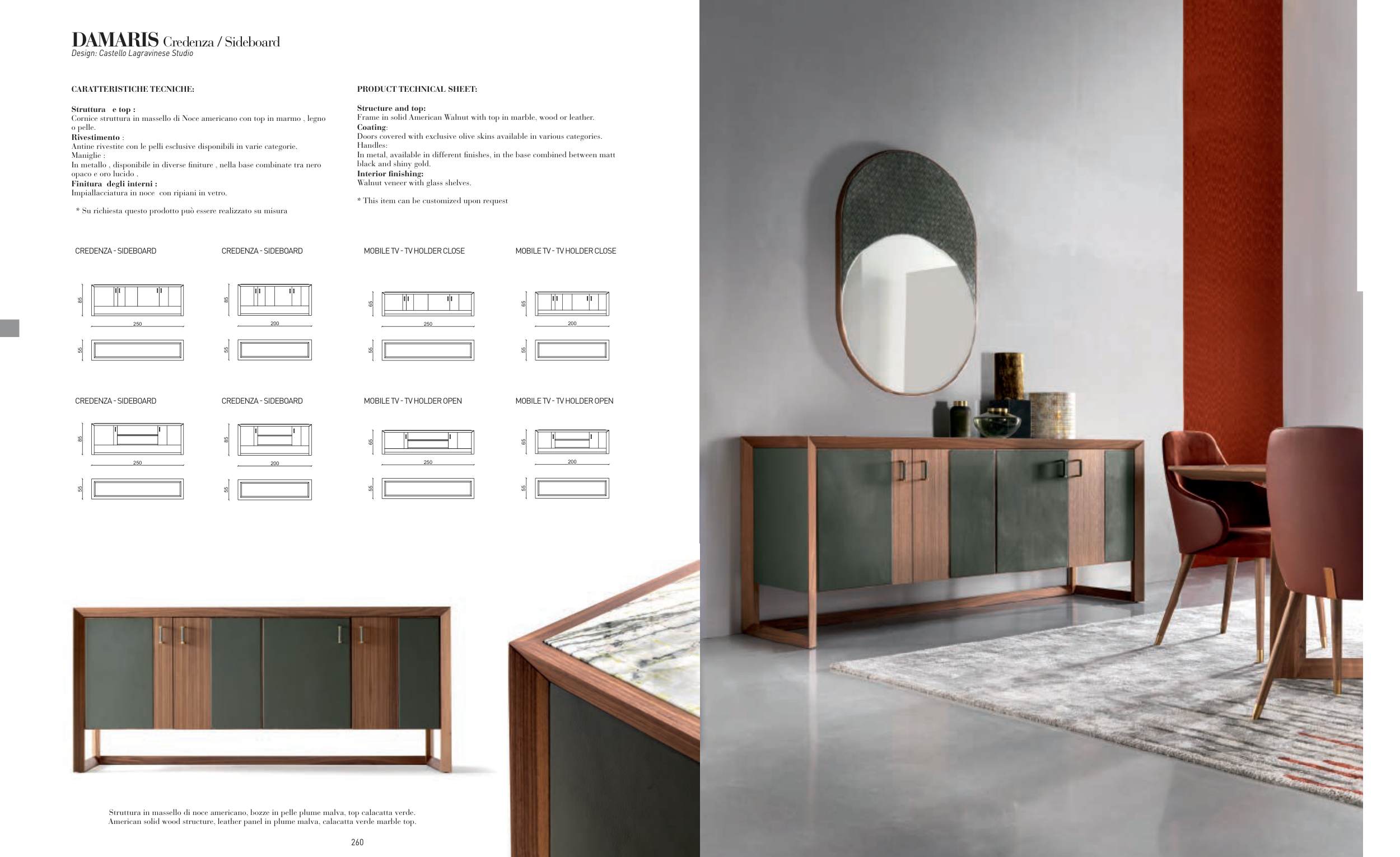 Struttura in massello di noce americano, bozze in pelle plume malva, top calacatta verde.