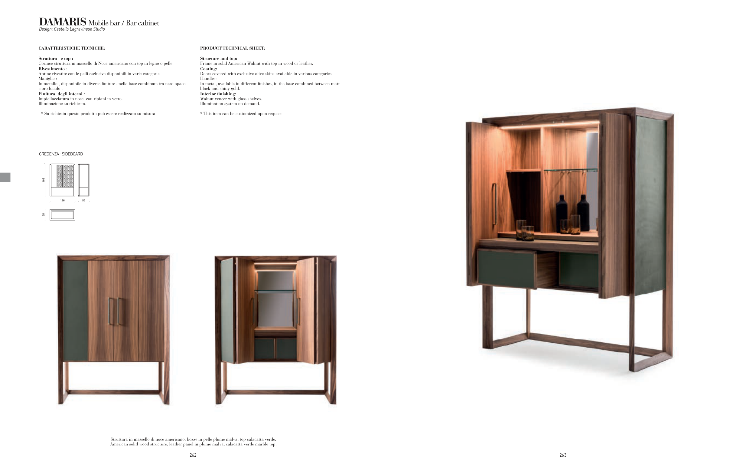 Struttura in massello di noce americano, bozze in pelle plume malva, top calacatta verde.