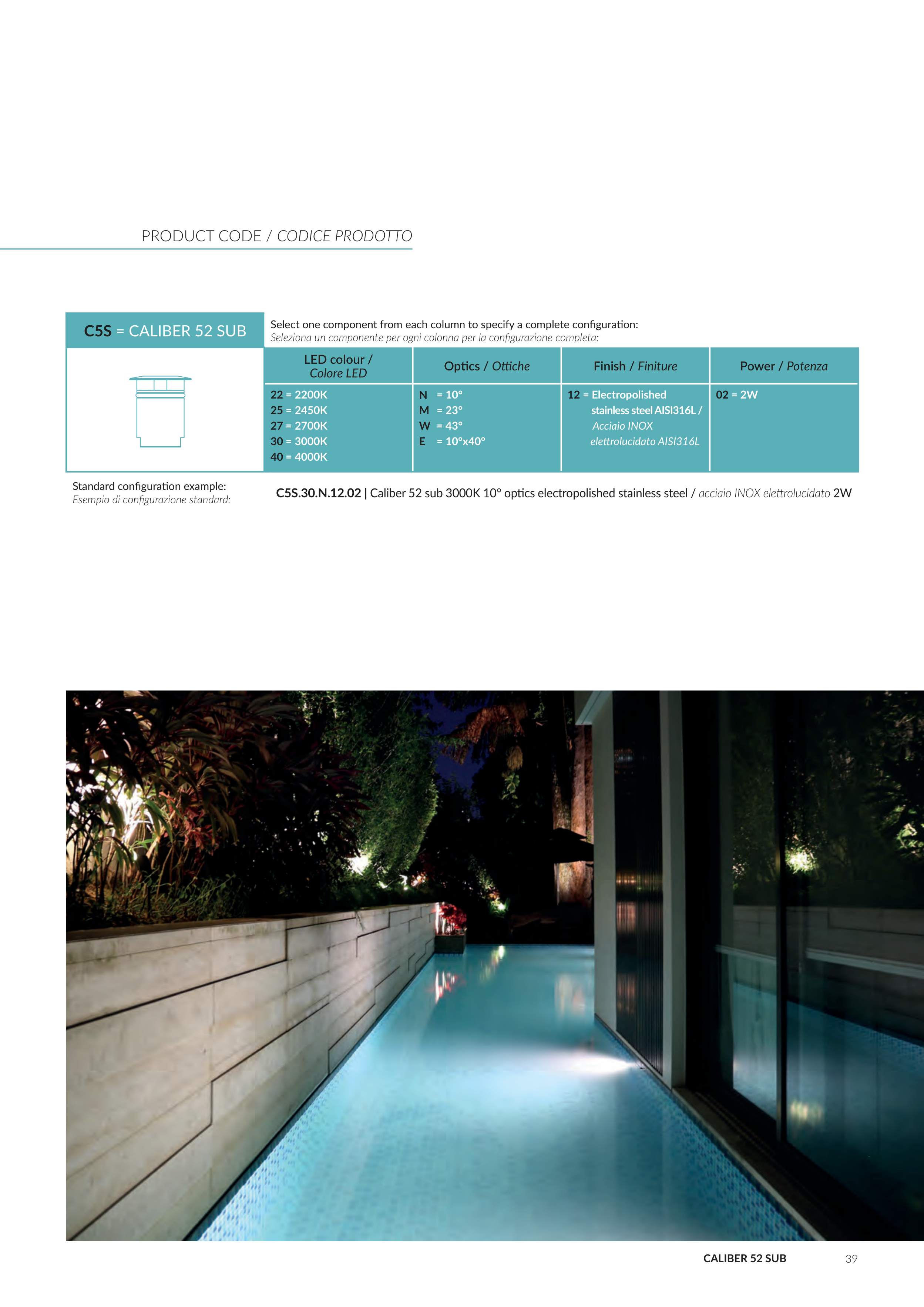 C5S.30.N.12.02 | Caliber 52 sub 3000K 10° optics electropolished stainless steel / acciaio INOX elettrolucidato 2W