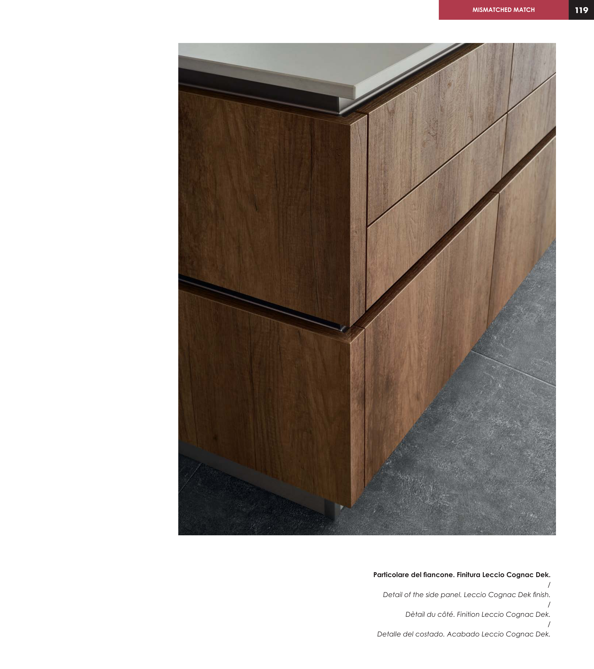 Particolare del fiancone. Finitura Leccio Cognac Dek.