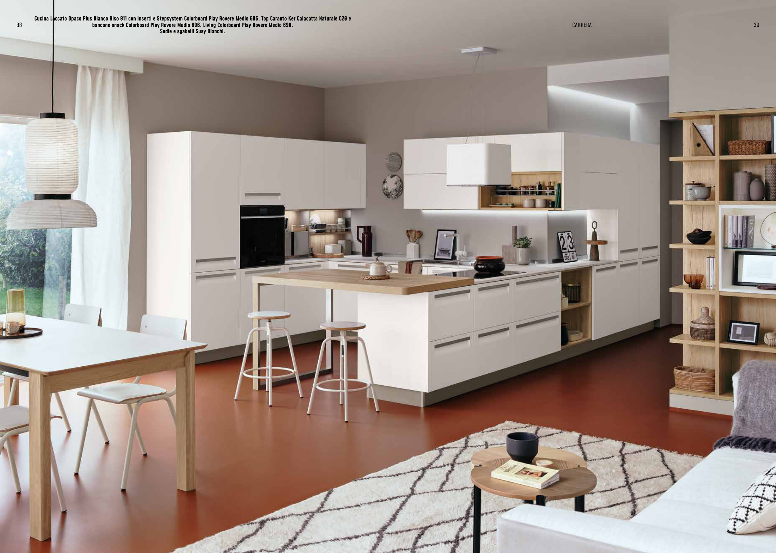Cucina Laccato Opaco Plus Bianco Riso 811 con inserti e Stepsystem Colorboard Play Rovere Medio 696. Top Caranto Ker Calacatta Naturale C20 e
