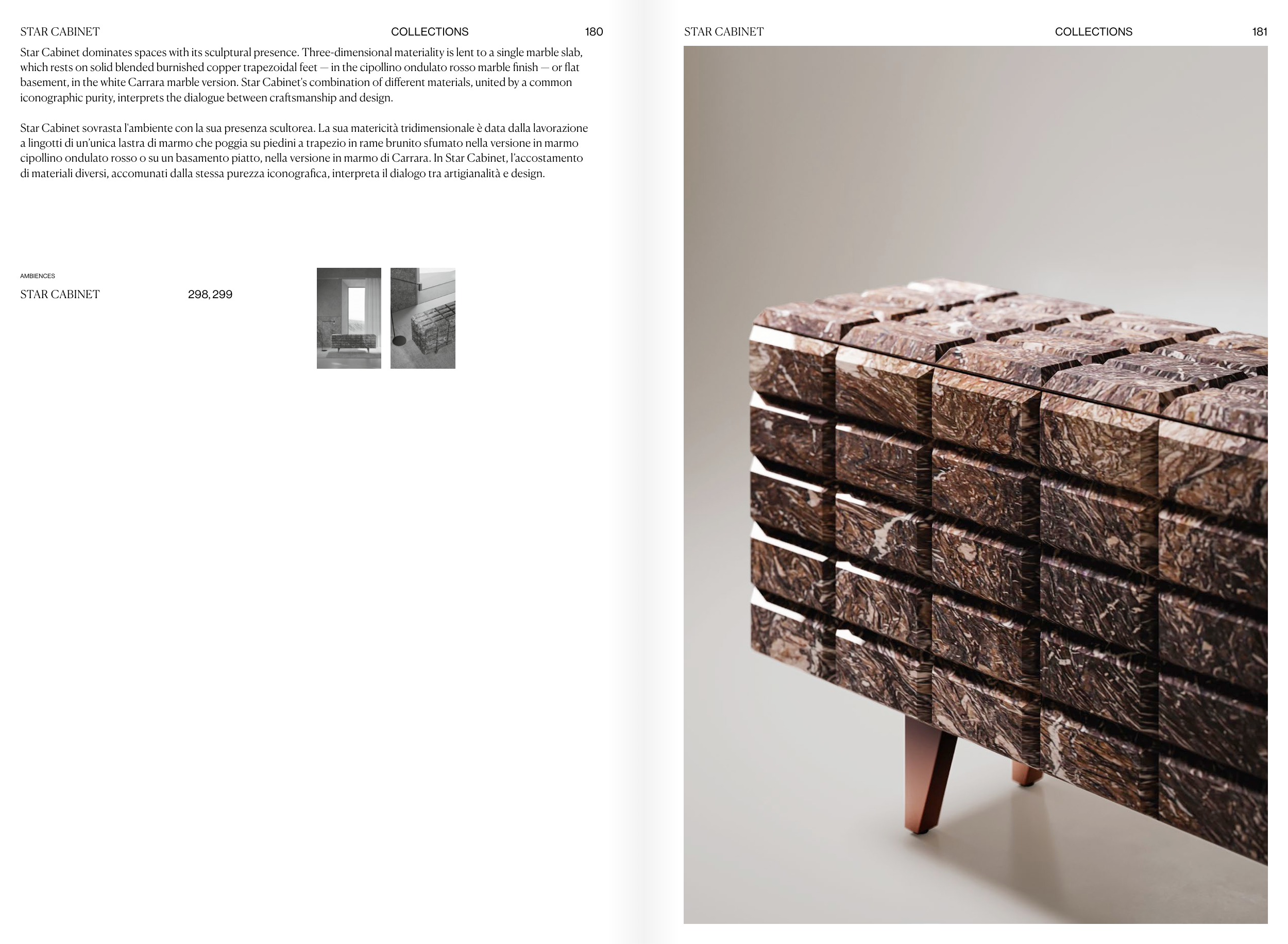 cipollino ondulato rosso o su un basamento piatto, nella versione in marmo di Carrara. In Star Cabinet, l’accostamento