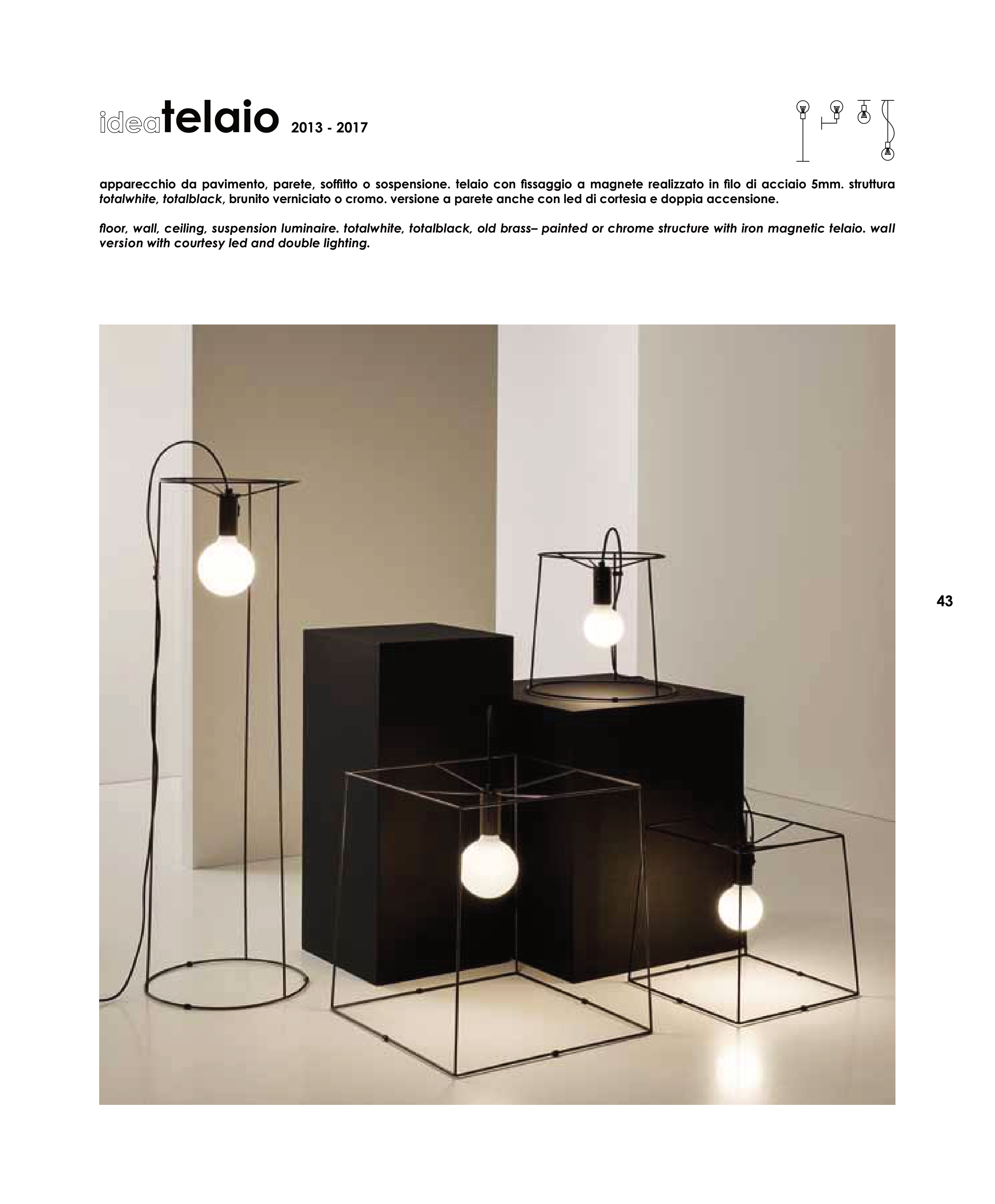 floor, wall, ceiling, suspension luminaire. totalwhite, totalblack, old brass– painted or chrome structure with iron magnetic telaio. wall