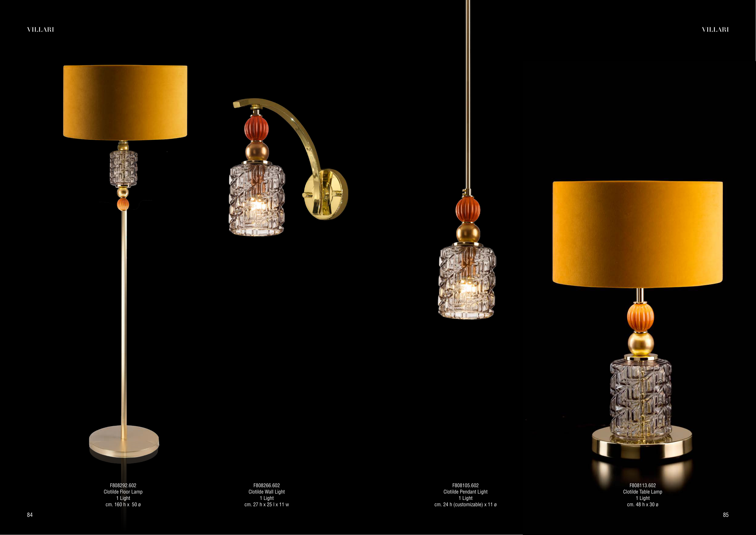 F808292.602 Clotilde Floor Lamp 1 Light cm. 160 h x 50 ø F808266.602 Clotilde Wall Light 1 Light cm. 27 h x 25 l x 11 w F808105.602 Clotilde Pendant Light 1 Light cm. 24 h (customizable) x 11 ø F808113.602 Clotilde Table Lamp 1 Light cm. 48 h x 30 ø 85 84