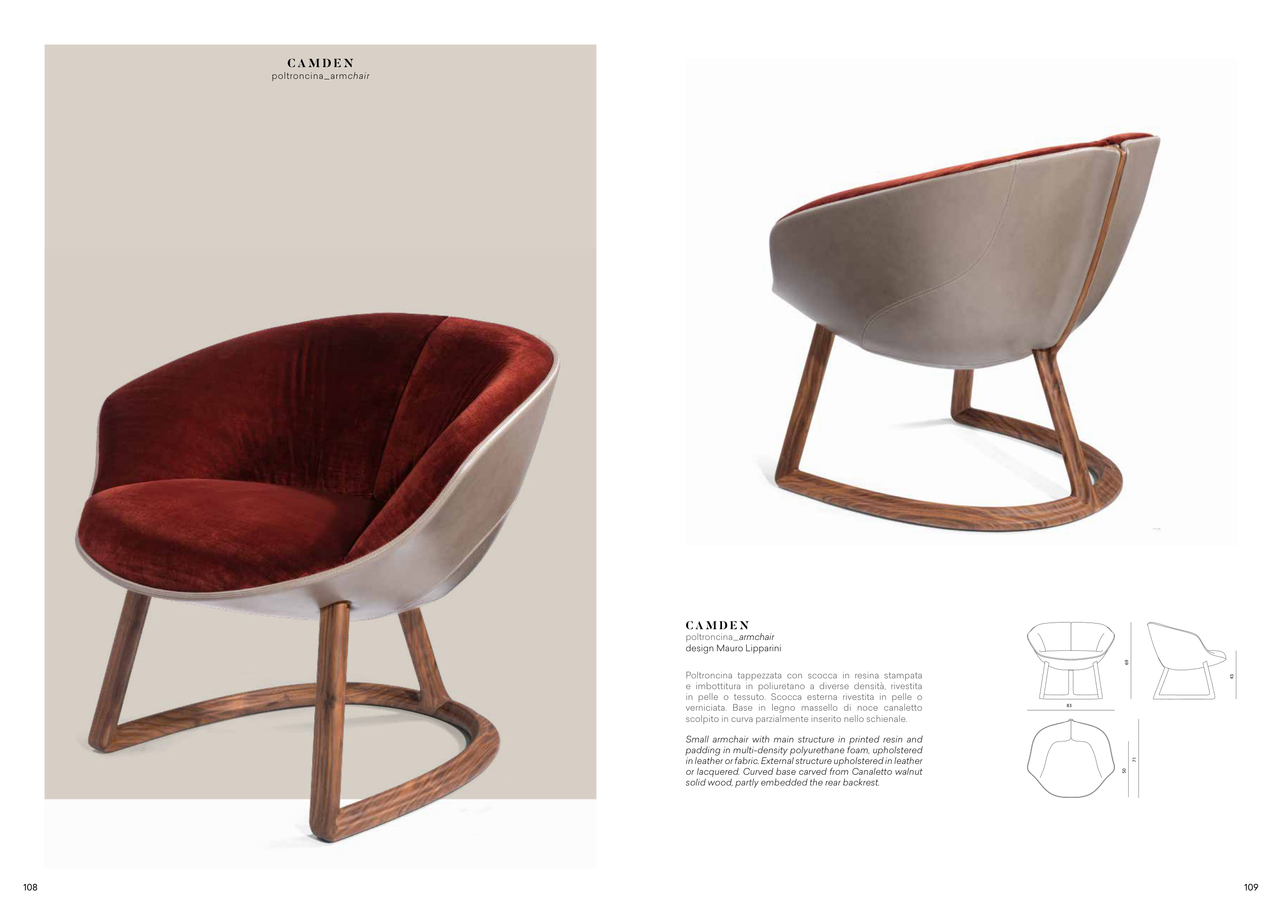 in leather or fabric. External structure upholstered in leather
