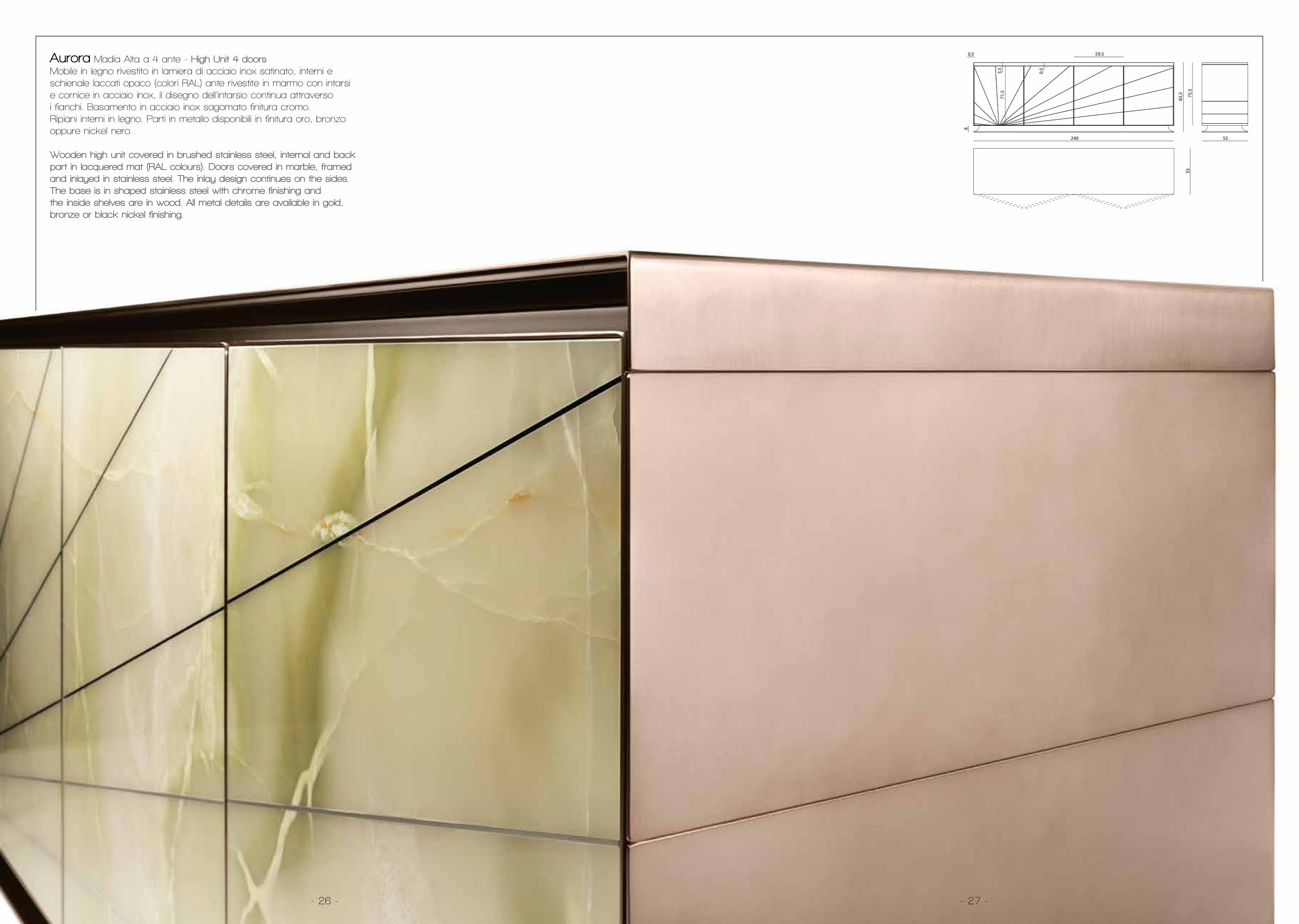 schienale laccati opaco (colori RAL) ante rivestite in marmo con intarsi