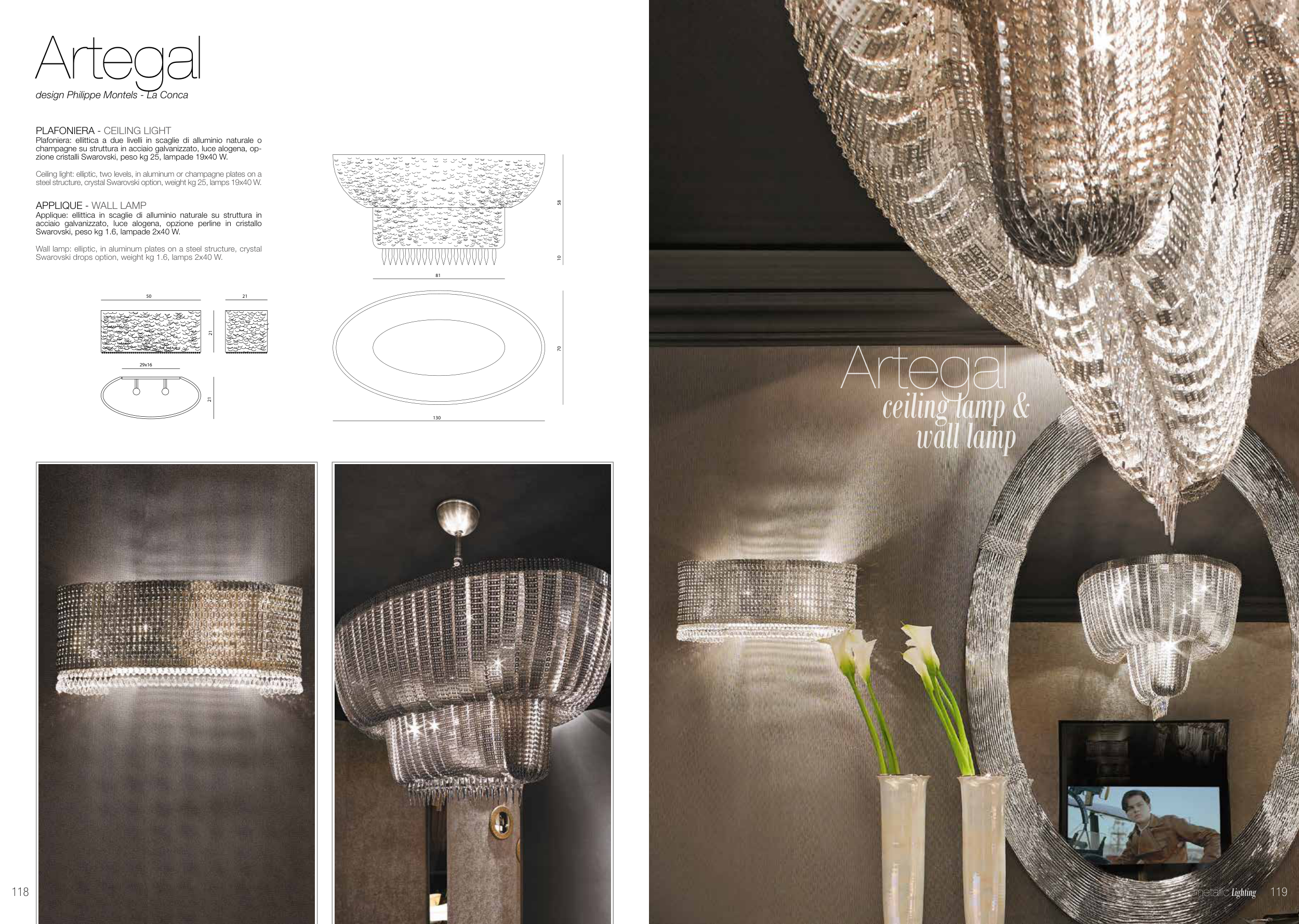 steel structure, crystal Swarovski option, weight kg 25, lamps 19x40 W.