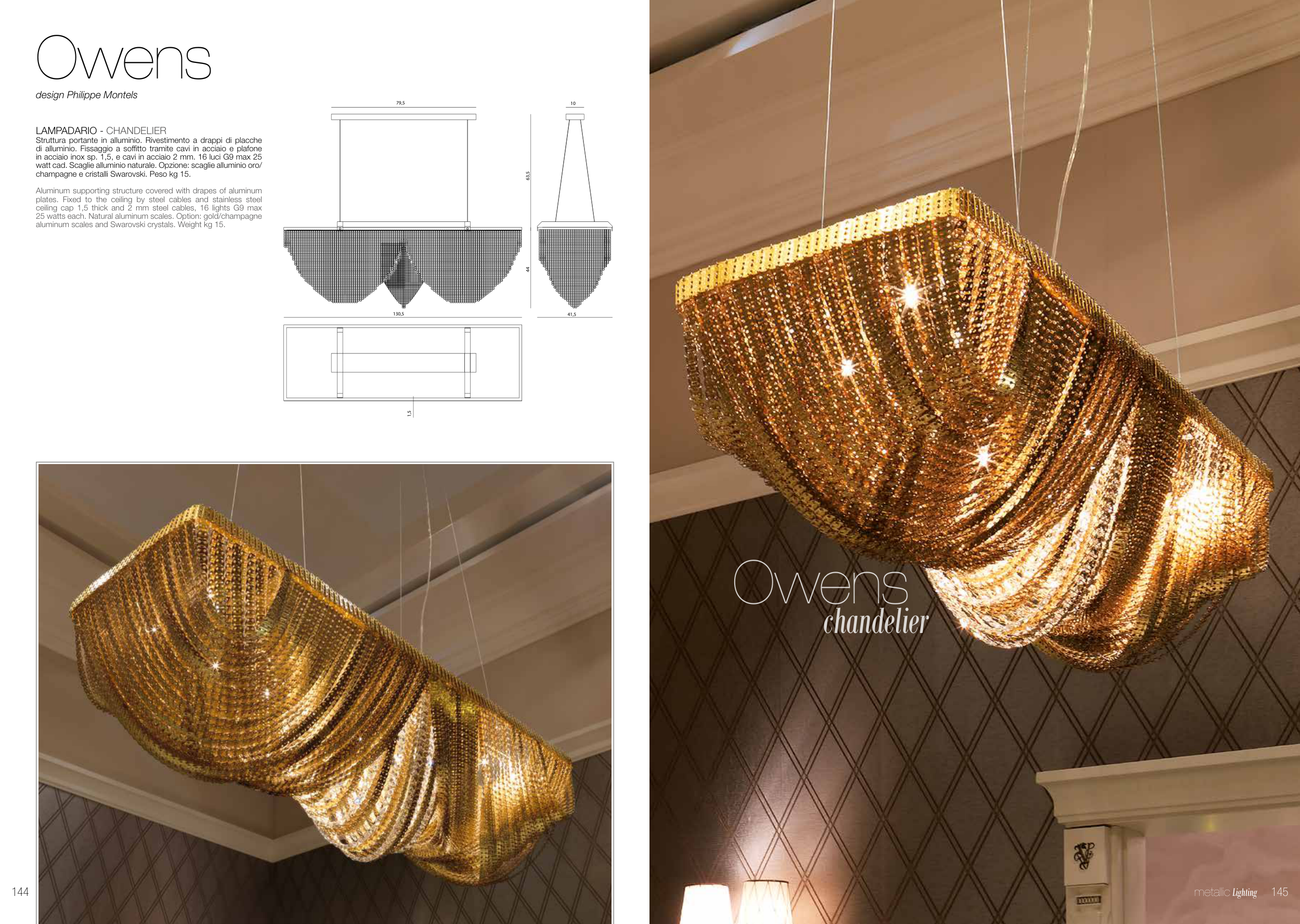 25 watts each. Natural aluminum scales. Option: gold/champagne