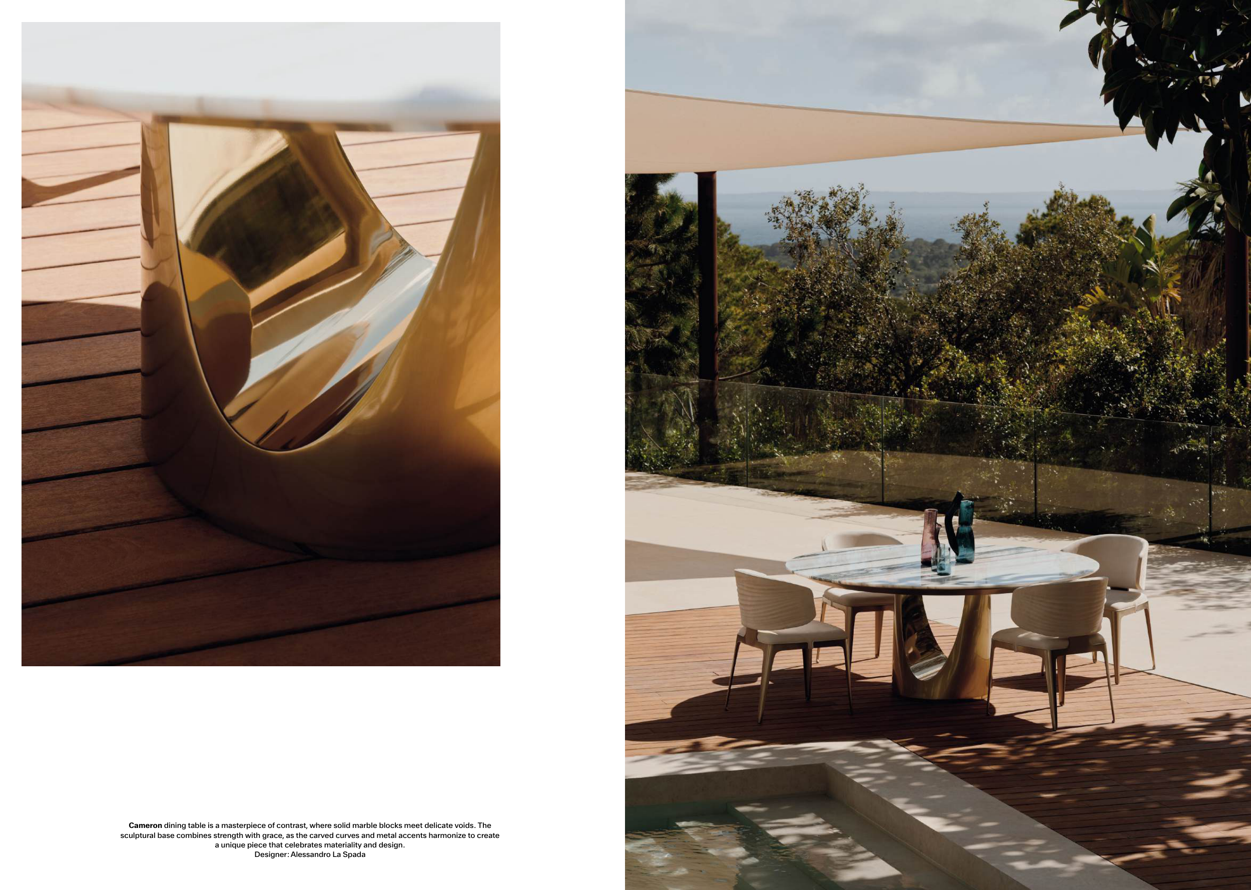 Cameron dining table is a masterpiece of contrast, where solid marble blocks meet delicate voids. The