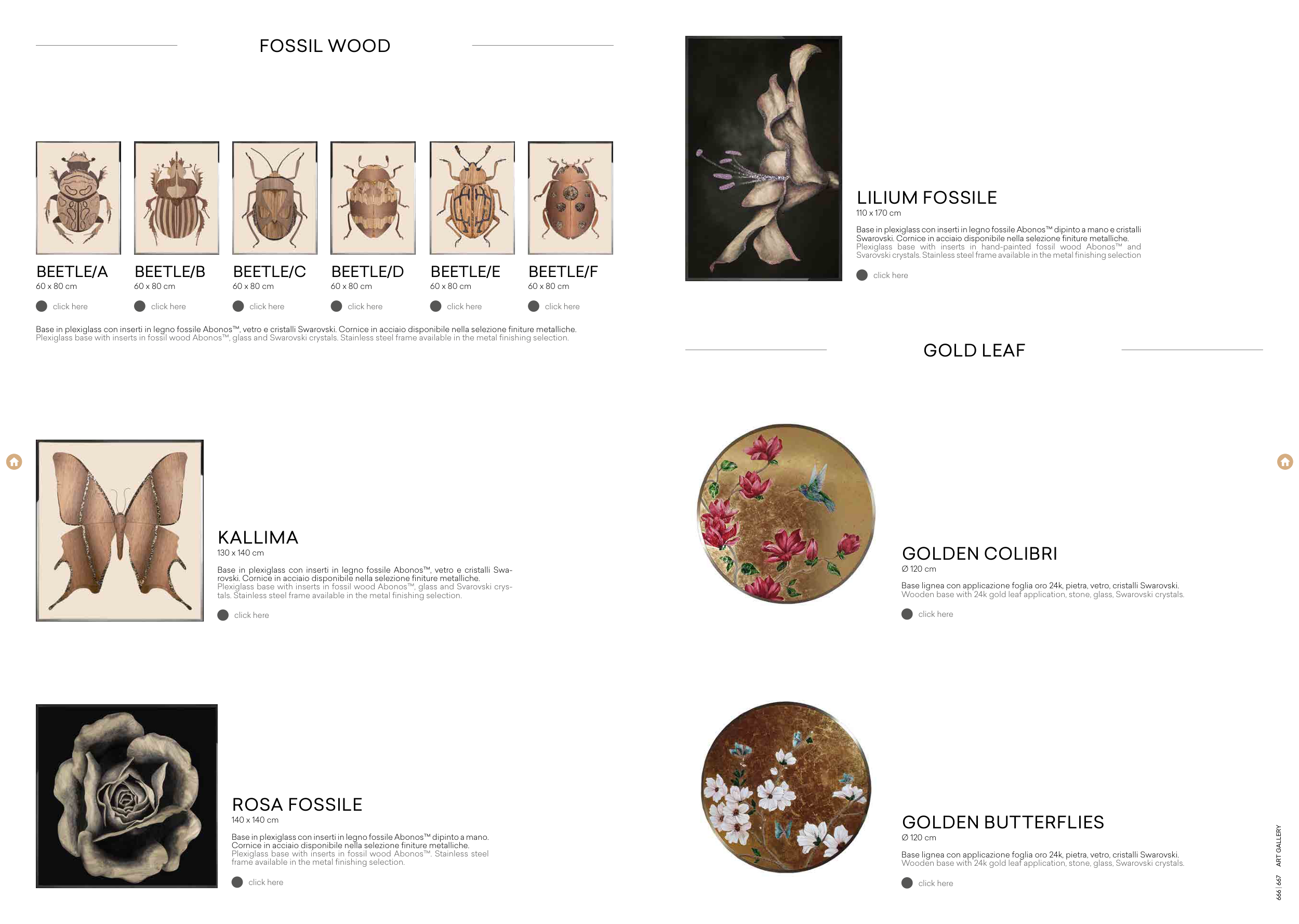 Plexiglass base with inserts in fossil wood Abonos™, glass and Swarovski crystals. Stainless steel frame available in the metal finishing selection.