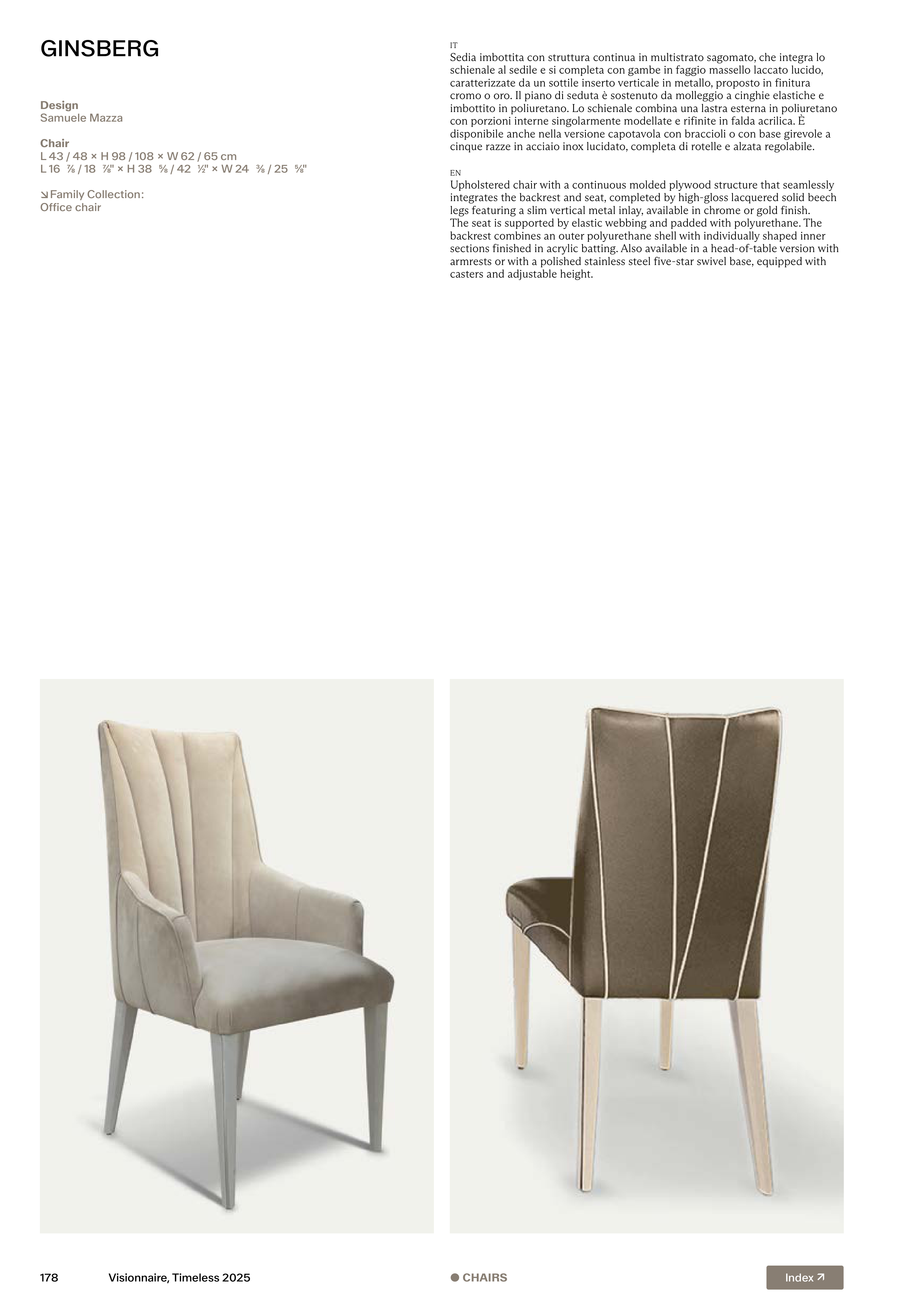 integrates the backrest and seat, completed by high-gloss lacquered solid beech