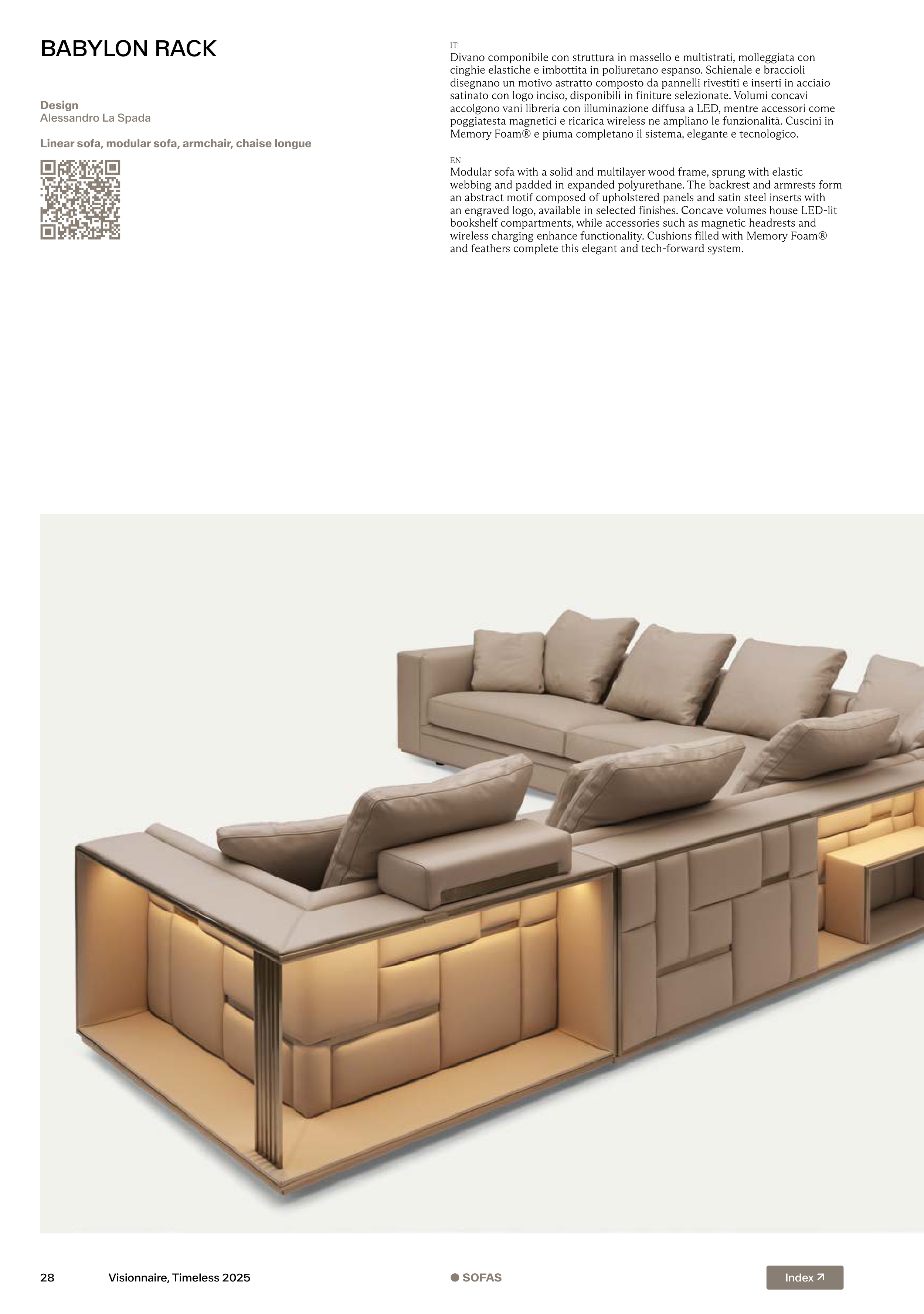 an engraved logo, available in selected finishes. Concave volumes house LED-lit