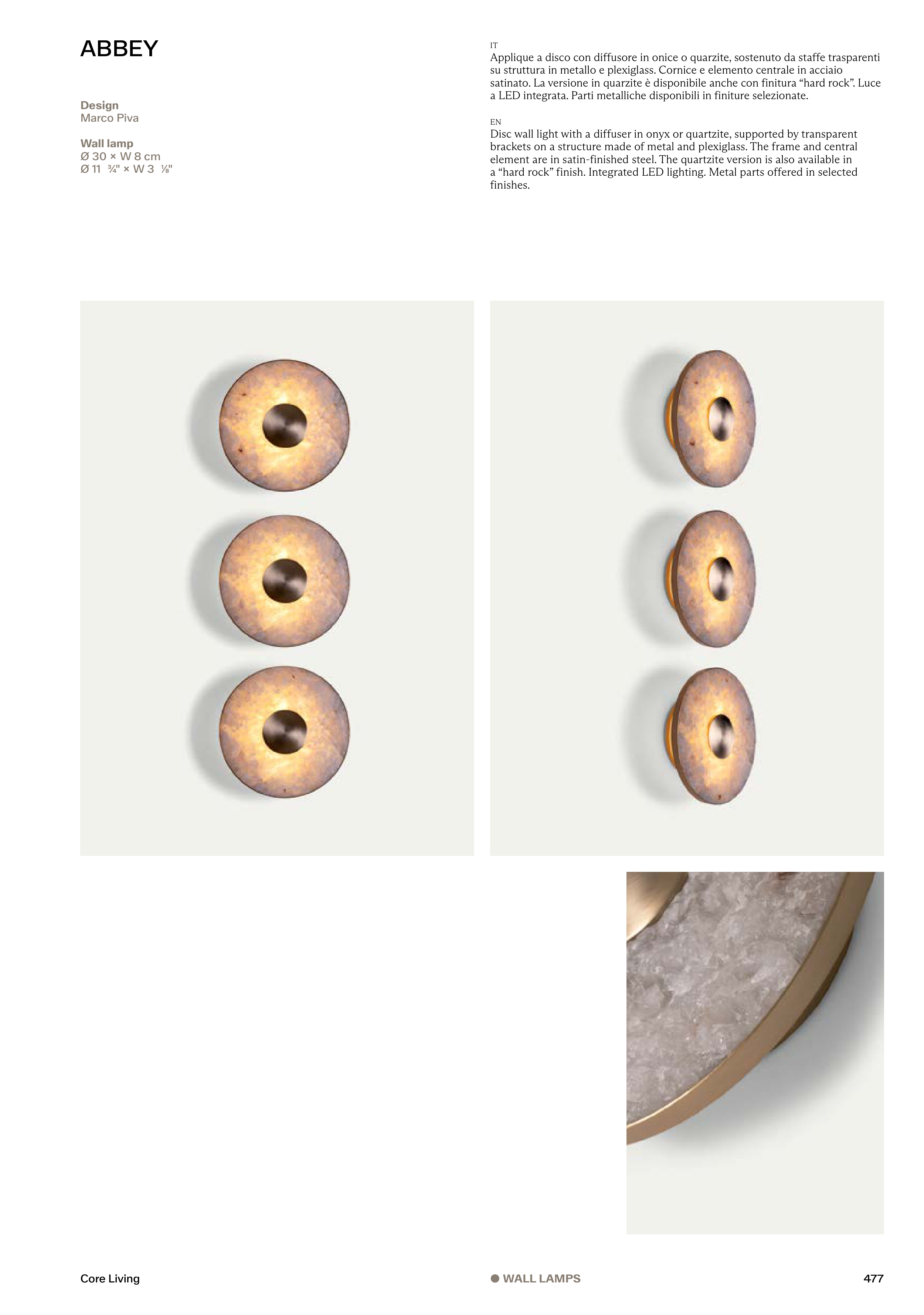 Applique a disco con diffusore in onice o quarzite, sostenuto da staffe trasparenti