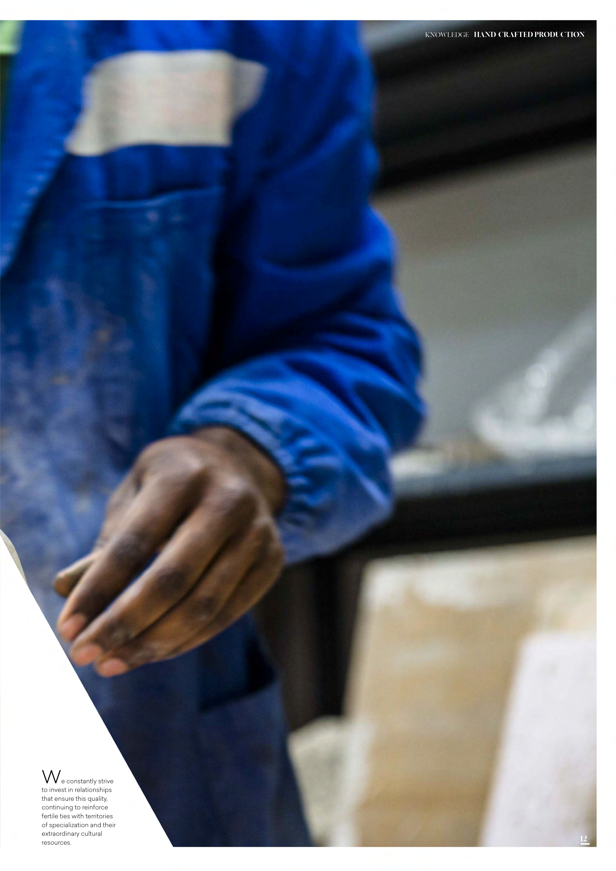 We constantly strive to invest in relationships that ensure this quality, continuing to reinforce fertile ties with territories of specialization and their extraordinary cultural resources. KNOWLEDGE - HAND-CRAFTED PRODUCTION 12 12