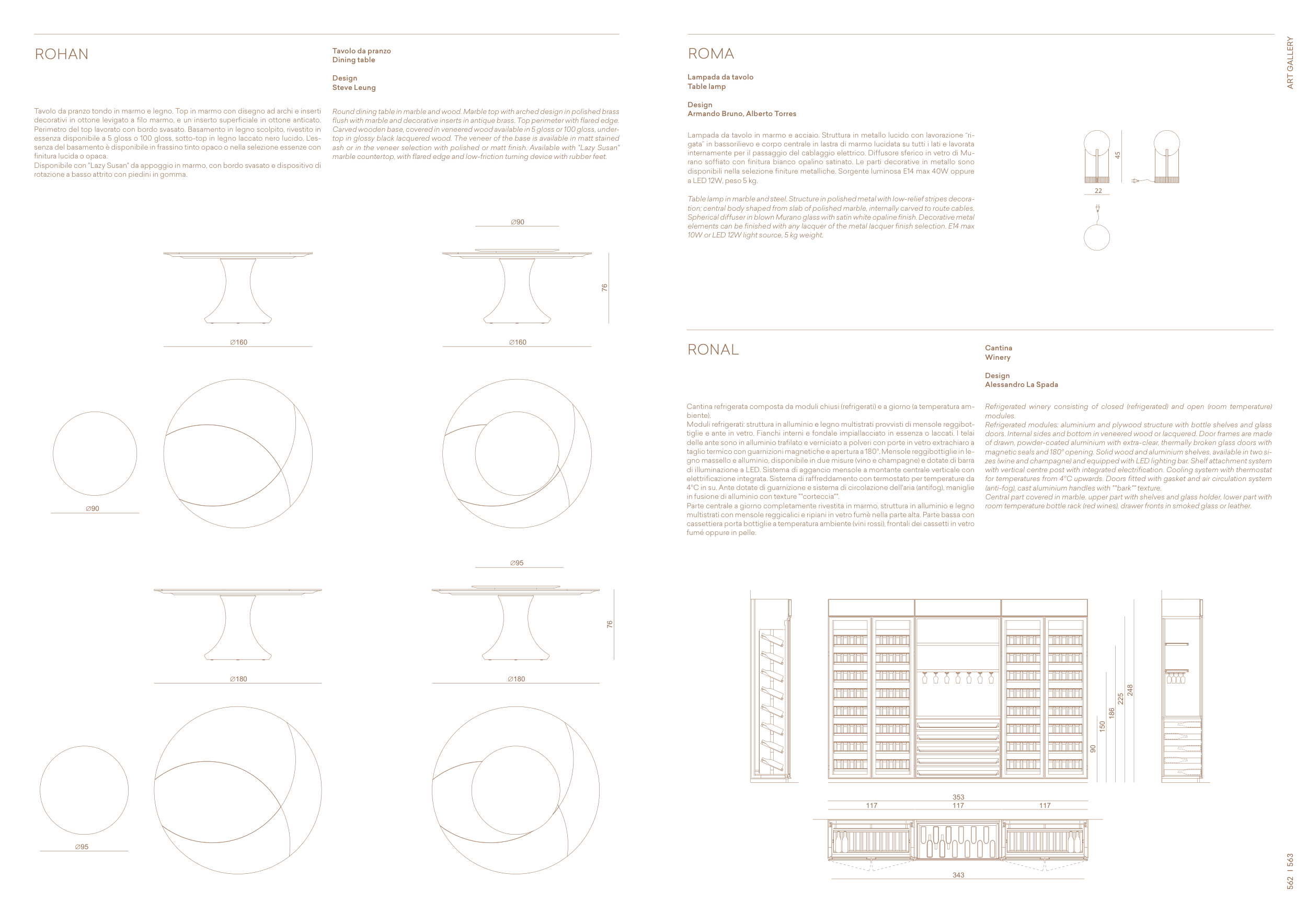 magnetic seals and 180° opening. Solid wood and aluminium shelves, available in two si-