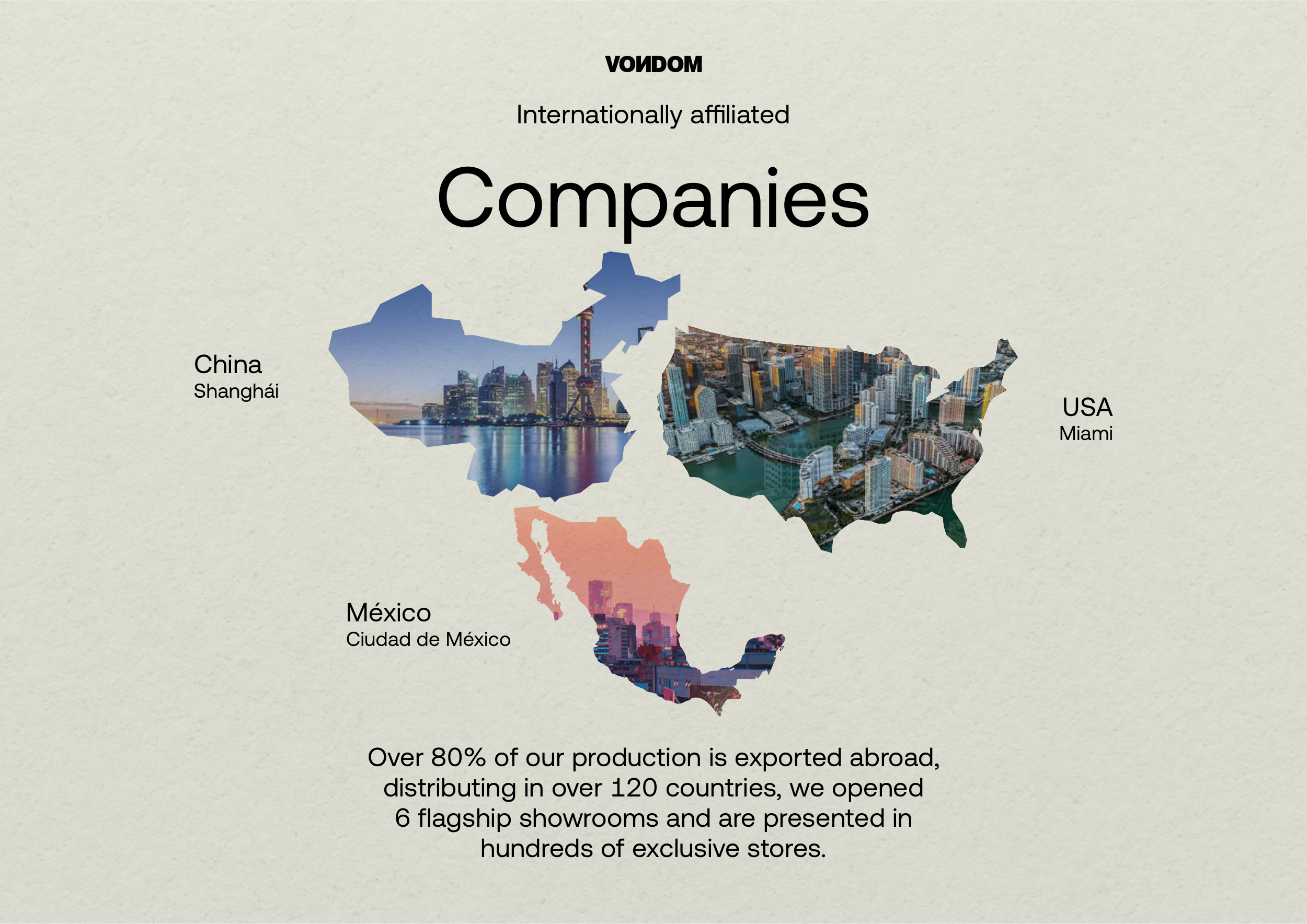 Internationally affiliated Companies Over 80% of our production is exported abroad, distributing in over 120 countries, we opened 6 flagship showrooms and are presented in hundreds of exclusive stores. USA Miami China Shanghái México Ciudad de México