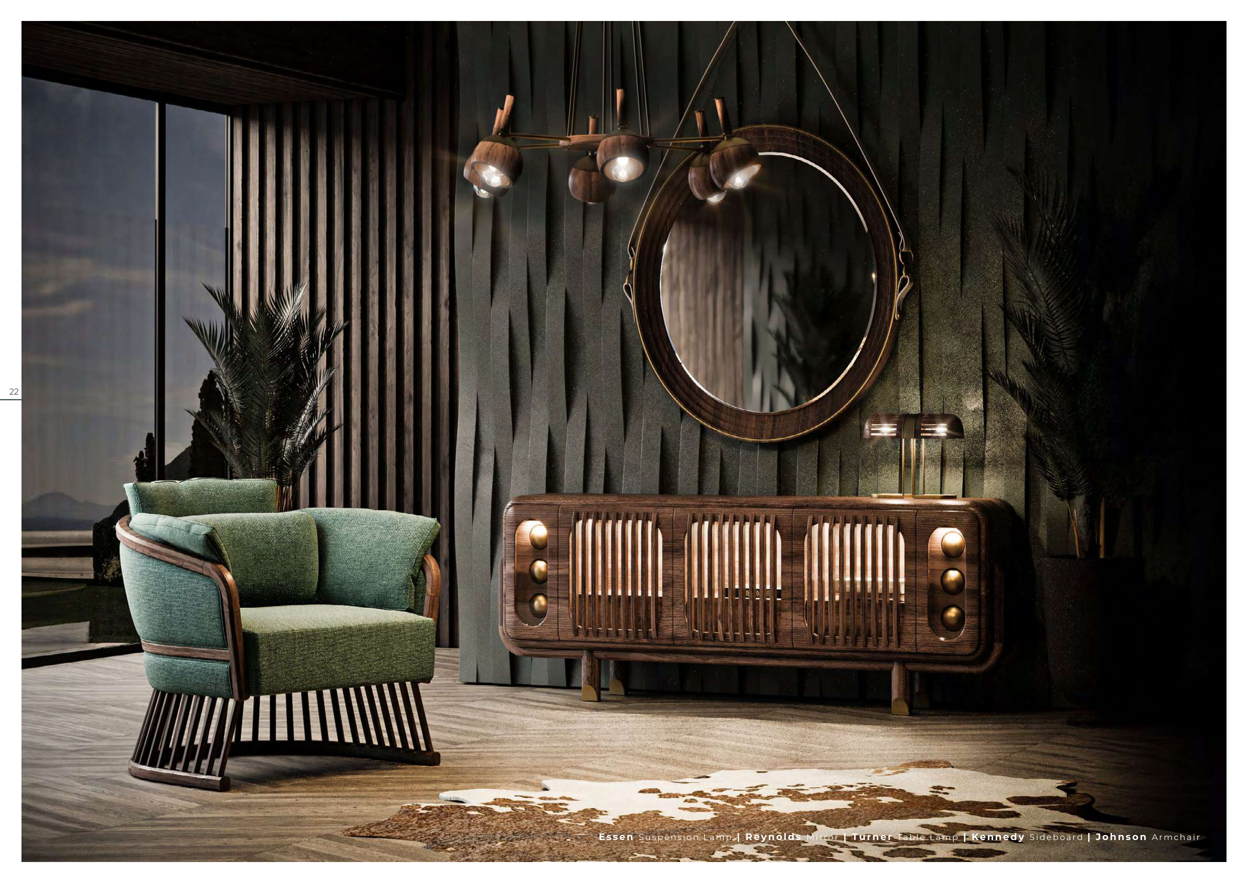 Es s en S u s p e n s i o n L a m p | R eyn ol ds M i rro r | Tu rn er Ta b l e L a m p | Ken n edy S i d e b oa rd | Johnson A rm cha i r