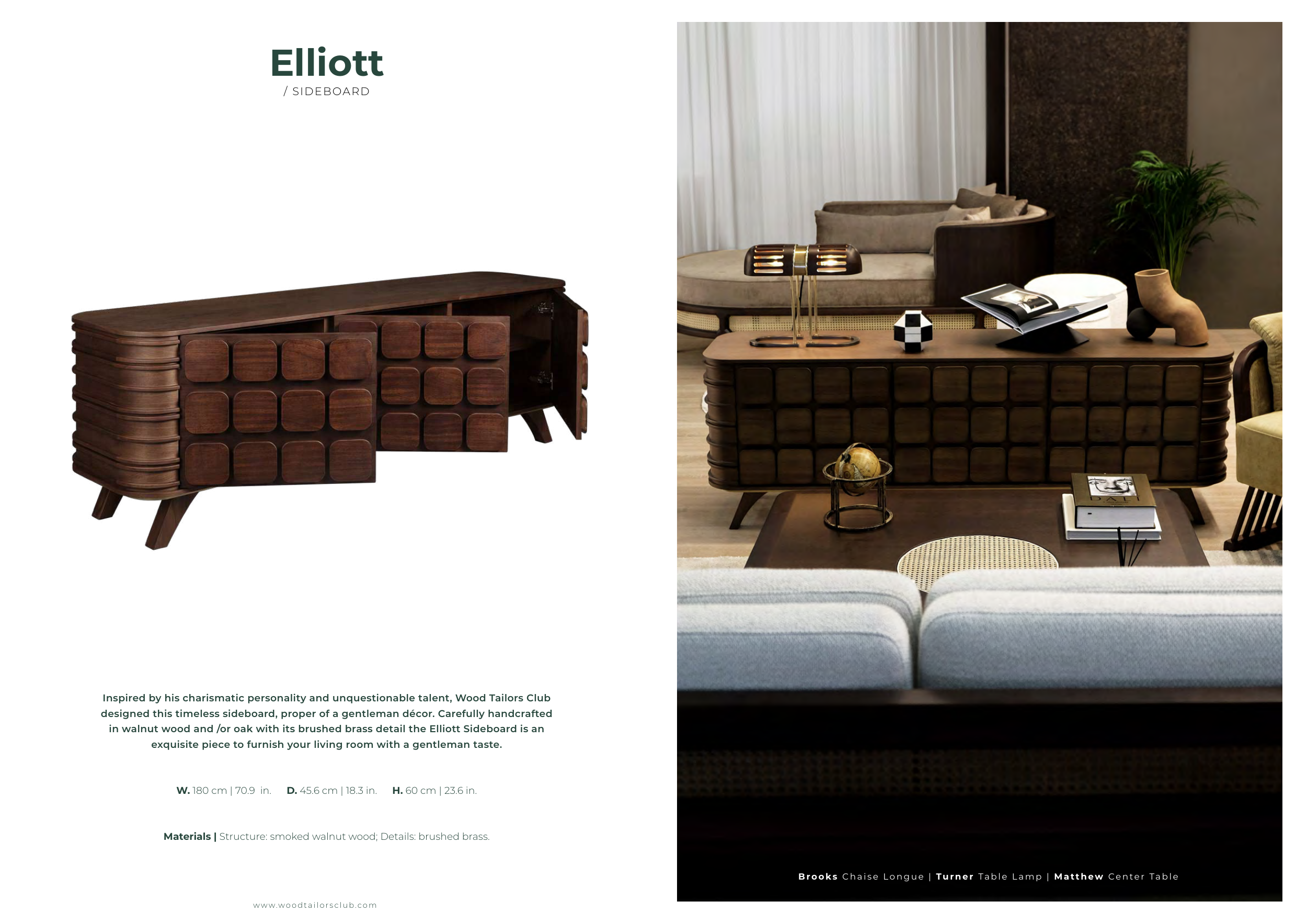 Materials | Structure: smoked walnut wood; Details: brushed brass.