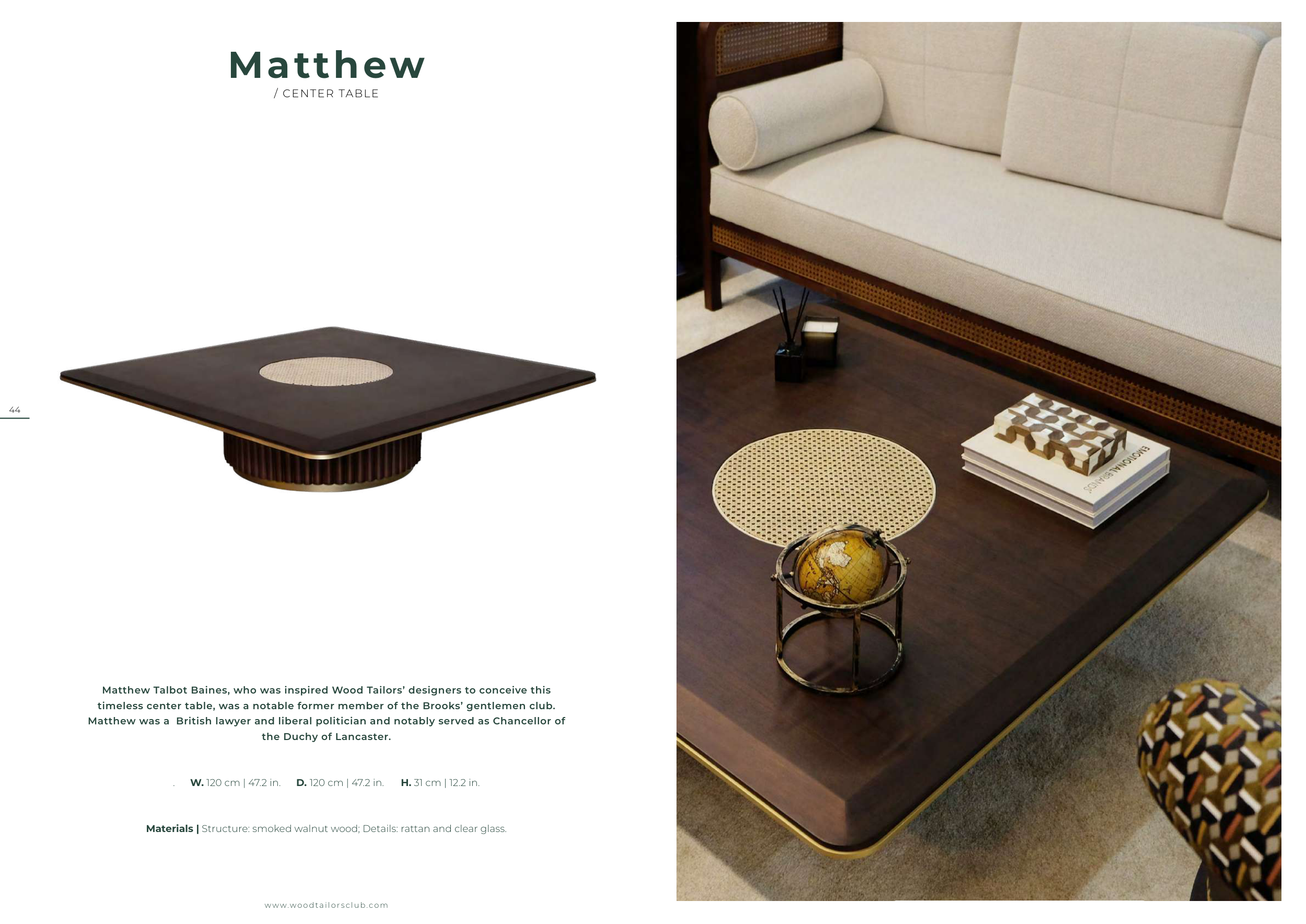 Materials | Structure: smoked walnut wood; Details: rattan and clear glass.