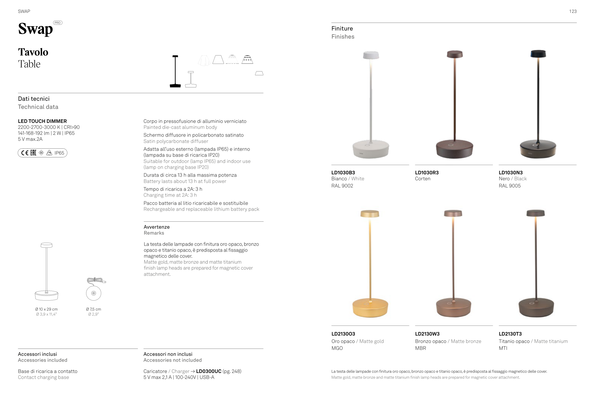 La testa delle lampade con finitura oro opaco, bronzo opaco e titanio opaco, è predisposta al fissaggio magnetico delle cover.