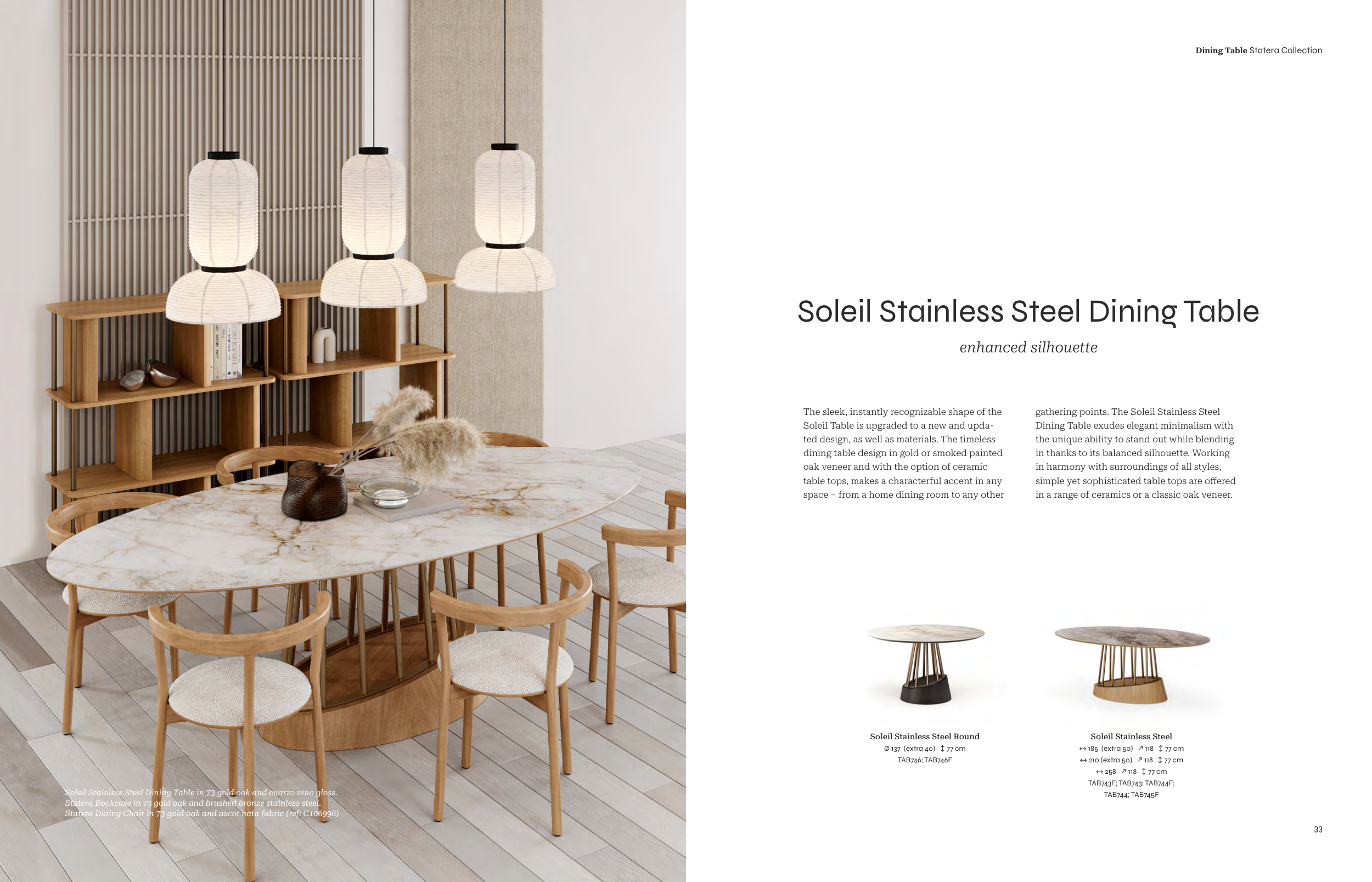 Soleil Stainless Steel Dining Table in 73 gold oak and cuarzo reno gloss.