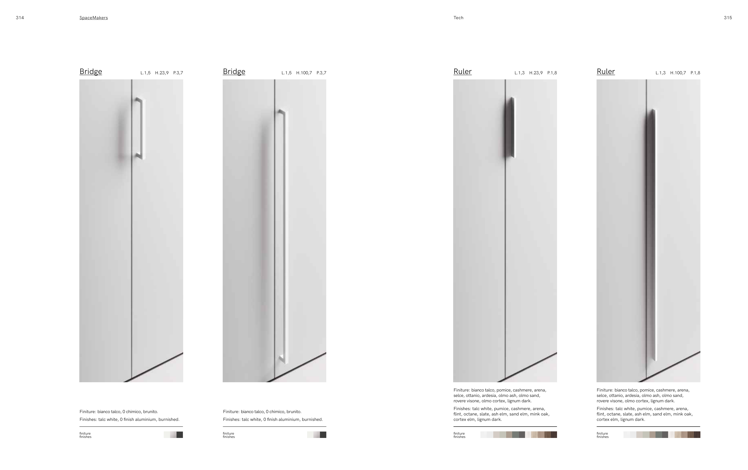 Finishes: talc white, 0 finish aluminium, burnished.