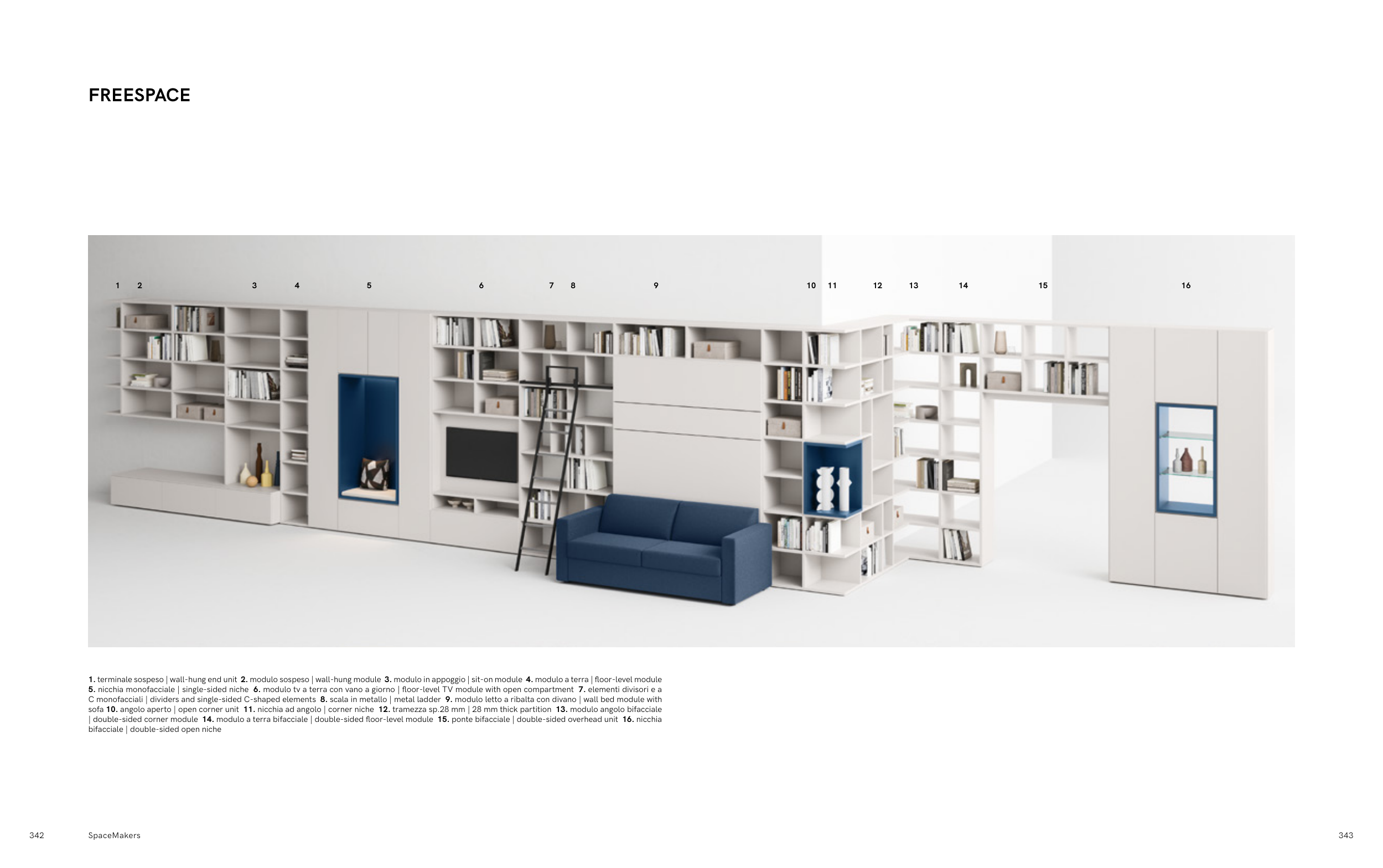 | double-sided corner module 14. modulo a terra bifacciale | double-sided floor-level module 15. ponte bifacciale | double-sided overhead unit 16. nicchia