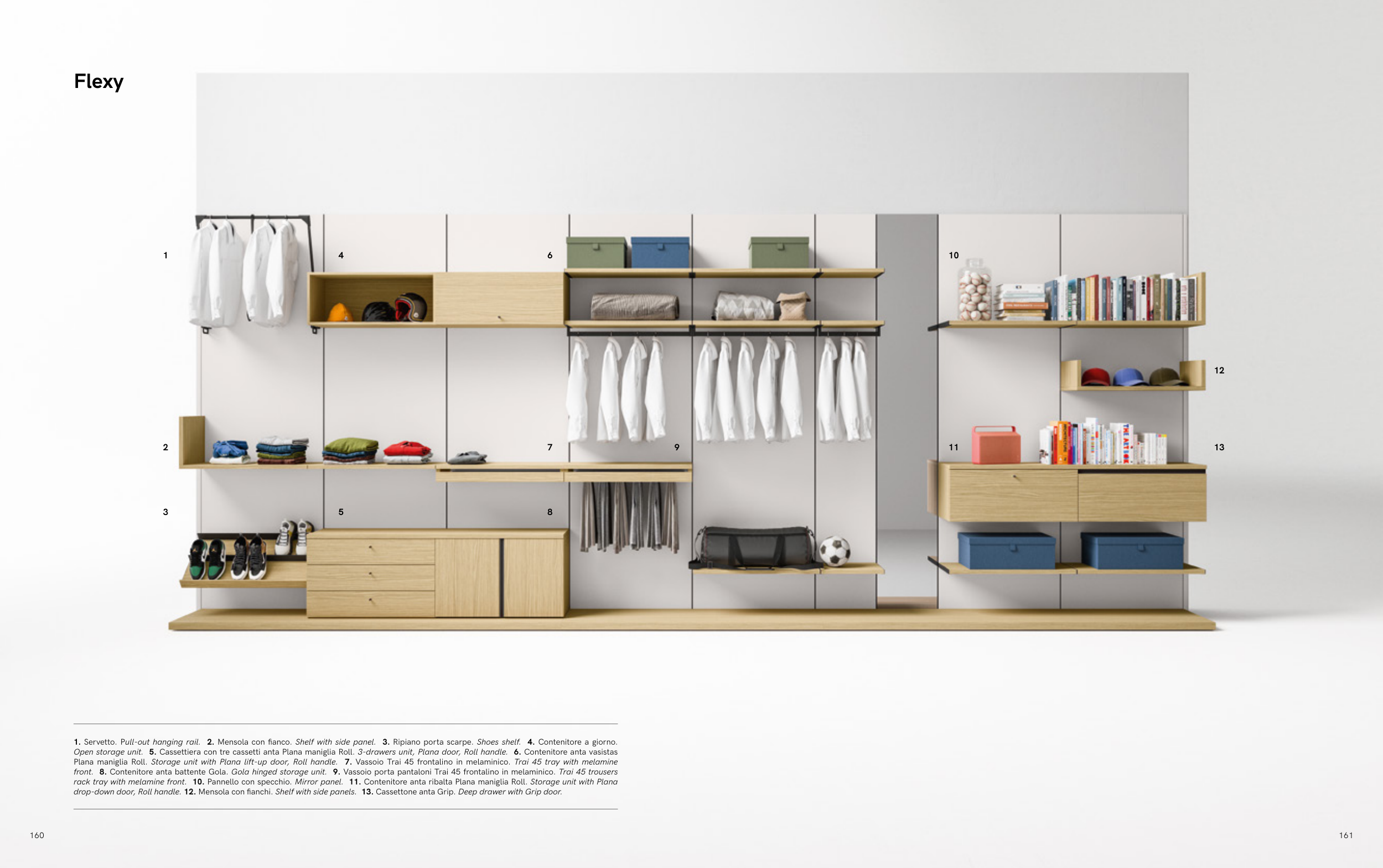 drop-down door, Roll handle. 12. Mensola con fianchi. Shelf with side panels. 13. Cassettone anta Grip. Deep drawer with Grip door.